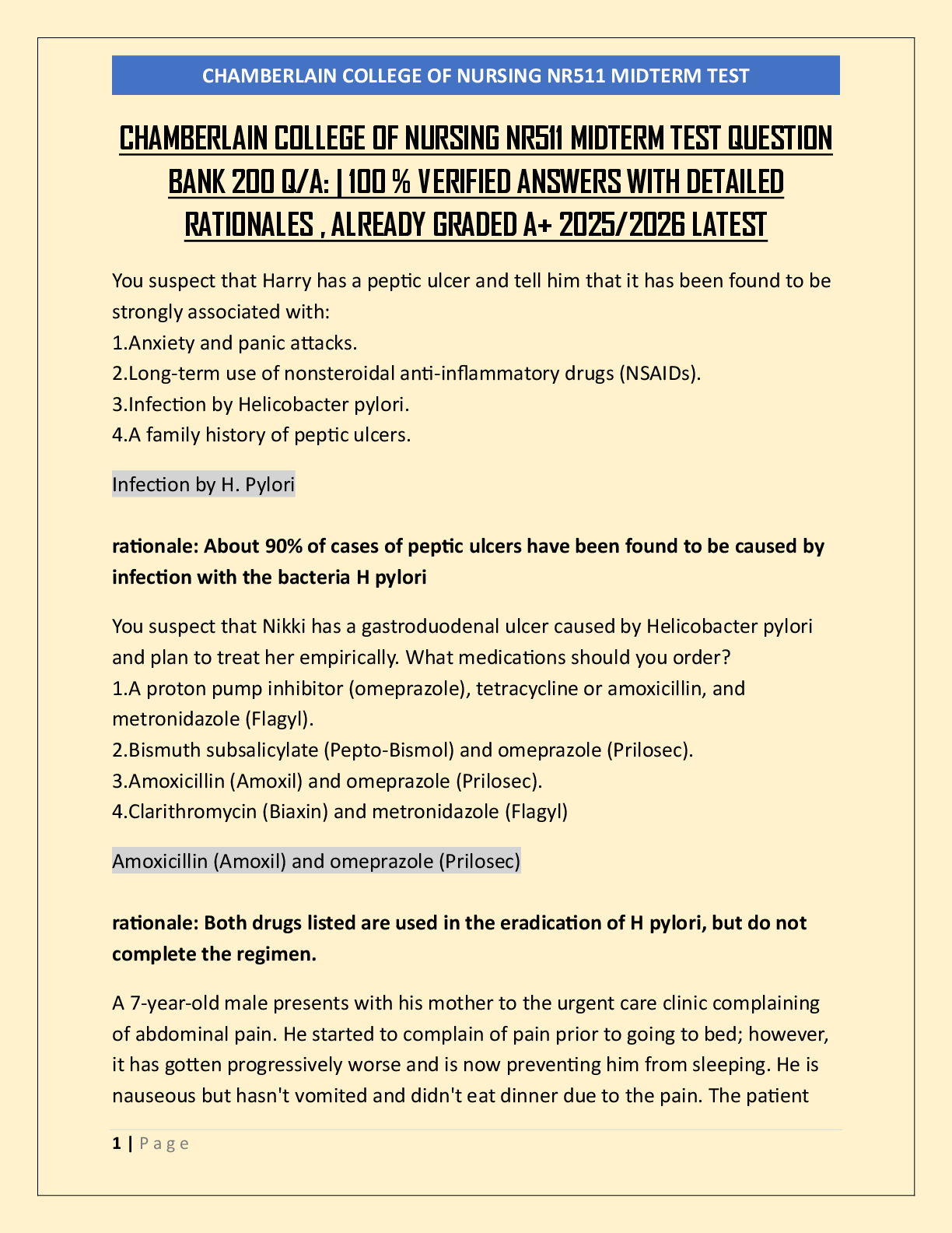 *NURSING > EXAM > CHAMBERLAIN COLLEGE OF NURSING NR511 MIDTERM TEST QUESTION BANK 200 Q/A: | 100 % VERIFIED ANSWERS WITH DETAILED RATIONALES , ALREADY GRADED A+ 2025/2026 LATEST