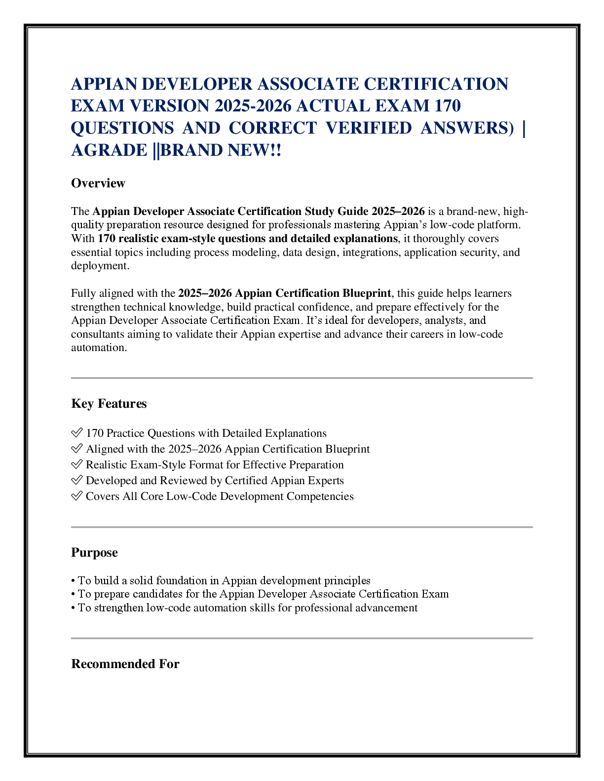 *NURSING > EXAM > APPIAN DEVELOPER ASSOCIATE CERTIFICATION EXAM VERSION 2025-2026 ACTUAL EXAM 170 QUESTIONS AND CORRECT VERIFIED ANSWERS) | AGRADE ||BRAND NEW!!