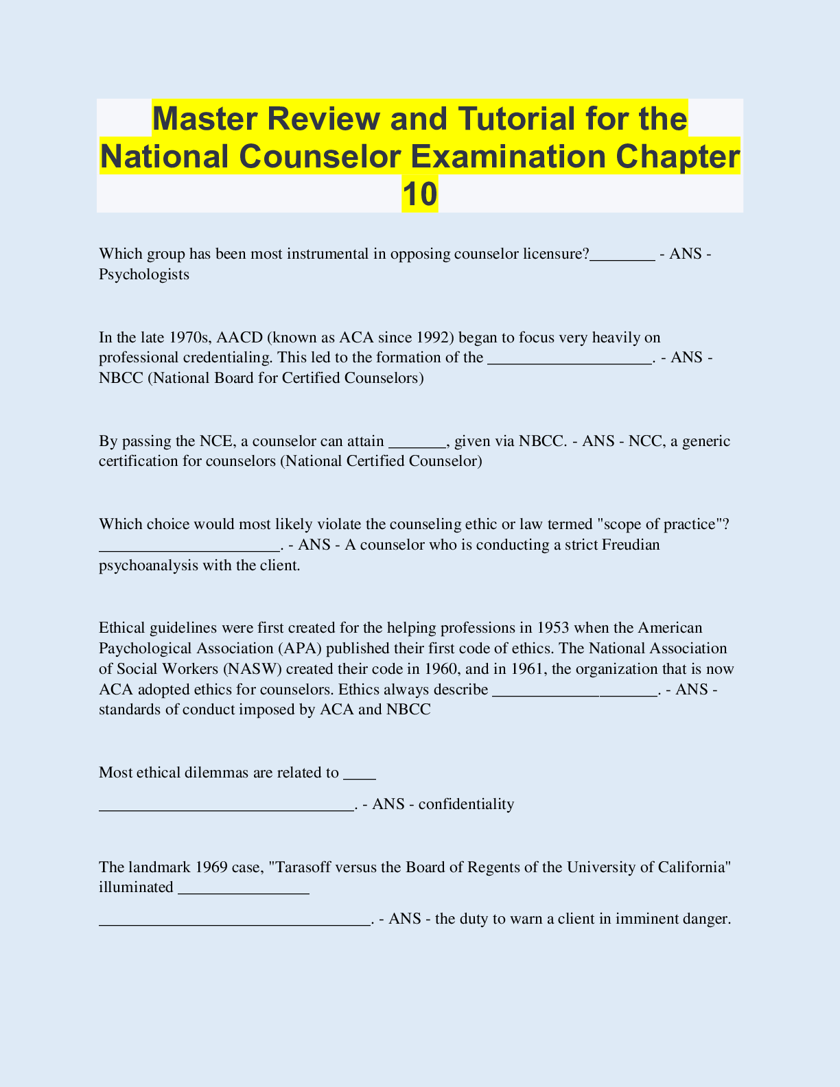 Psychology > EXAM > Master Review and Tutorial for the National Counselor Examination Chapter 10 | 100 Questions with 100% Correct Answers | Updated & Verified