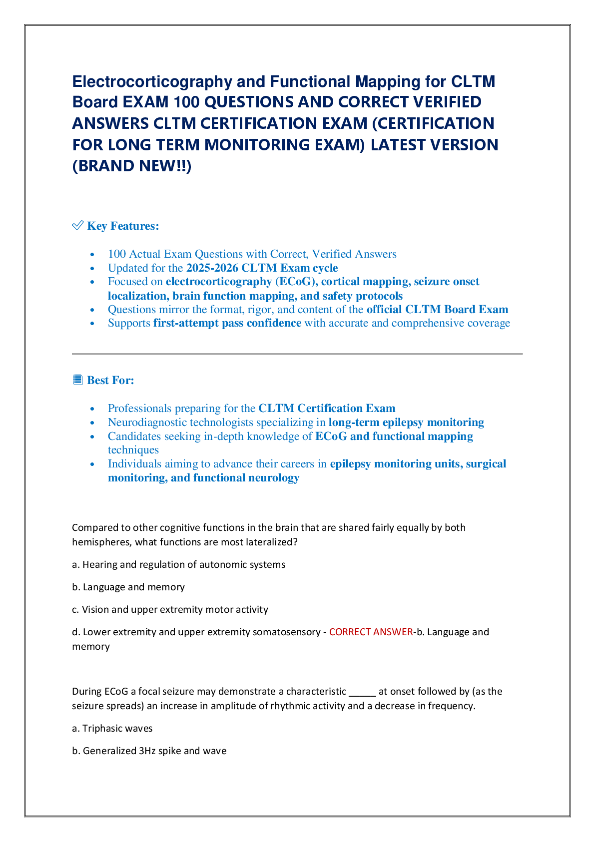 > Electrocorticography and Functional Mapping for CLTM Board EXAM 100 QUESTIONS AND CORRECT VERIFIED ANSWERS CLTM CERTIFICATION EXAM (CERTIFICATION FOR LONG TERM MONITORING EXAM) LATEST VERSION (BRAND NEW!!)