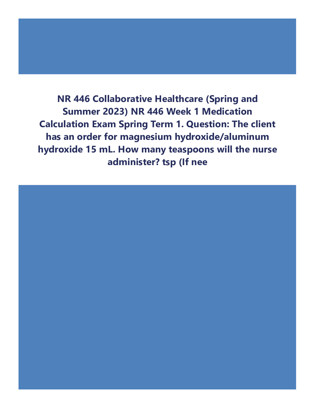 *NURSING > EXAM > NR 446 Collaborative Healthcare (Spring and Summer 2023) NR 446 Week 1 Medication Calculation Exam Spring Term 1. Question: The client has an order for magnesium hydroxide/aluminum hydroxide 15 mL. How many teaspoons will the nurse administer? tsp (If nee