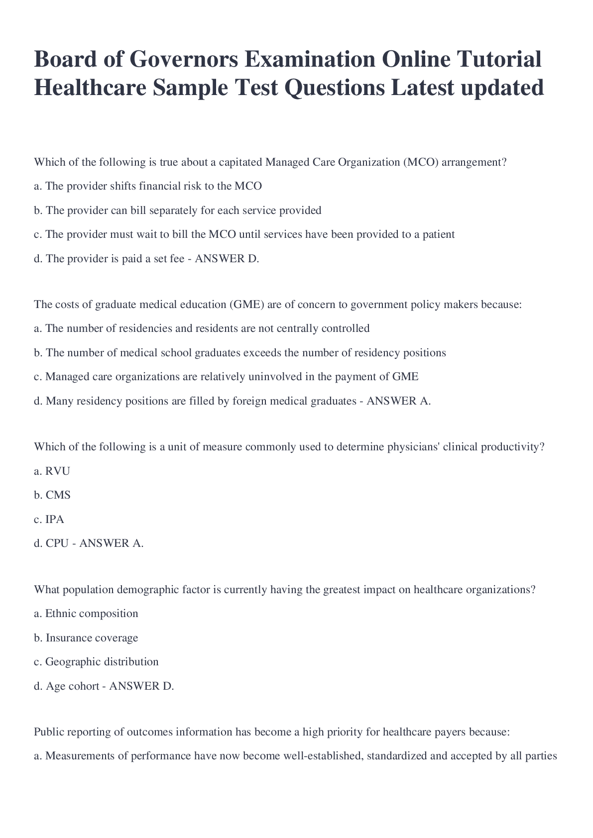 Health Care > EXAM > Board of Governors Examination Online Tutorial Healthcare Sample Test Questions