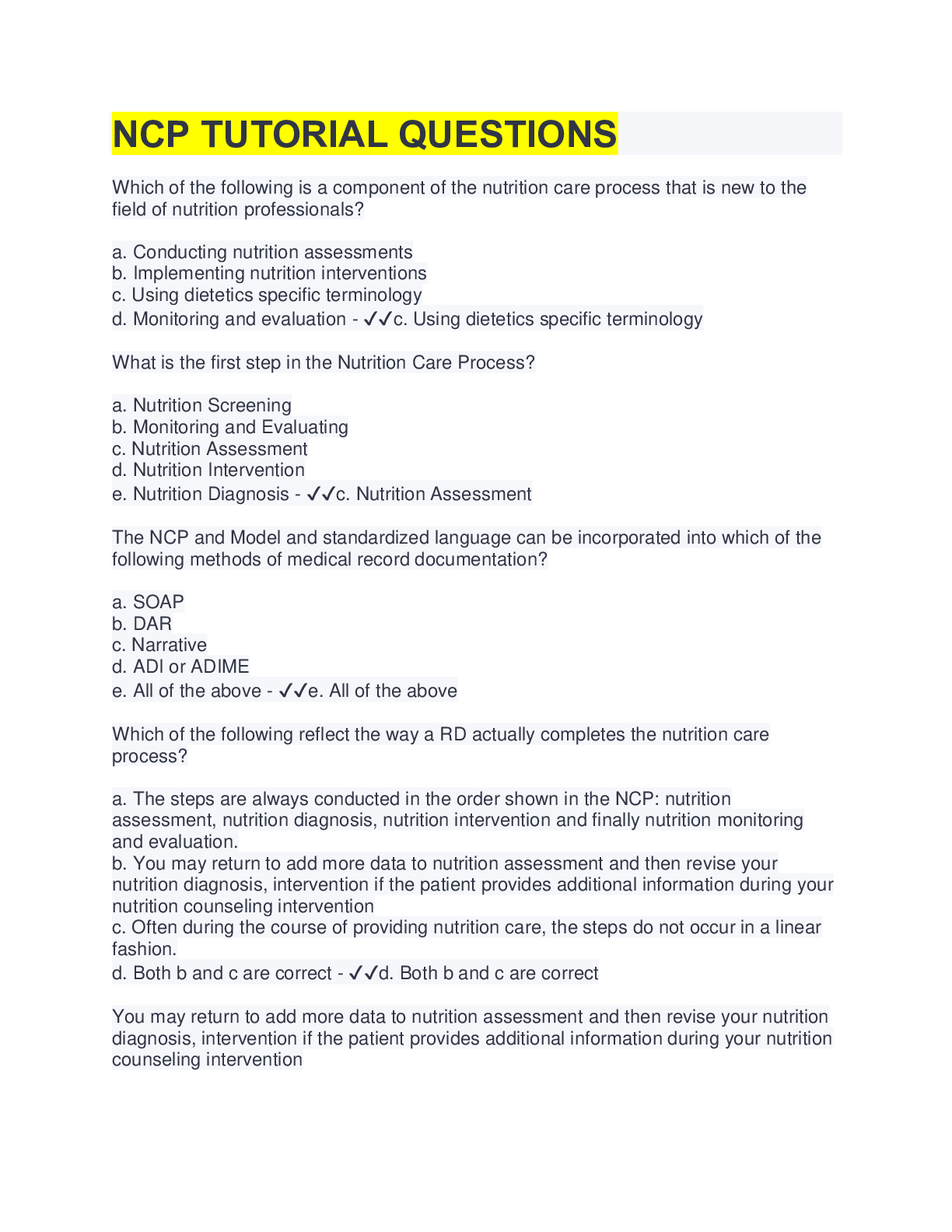 Nutrition > QUESTIONS & ANSWERS > NCP TUTORIAL QUESTIONS WITH ALL ANSWERS 100% CORRECT