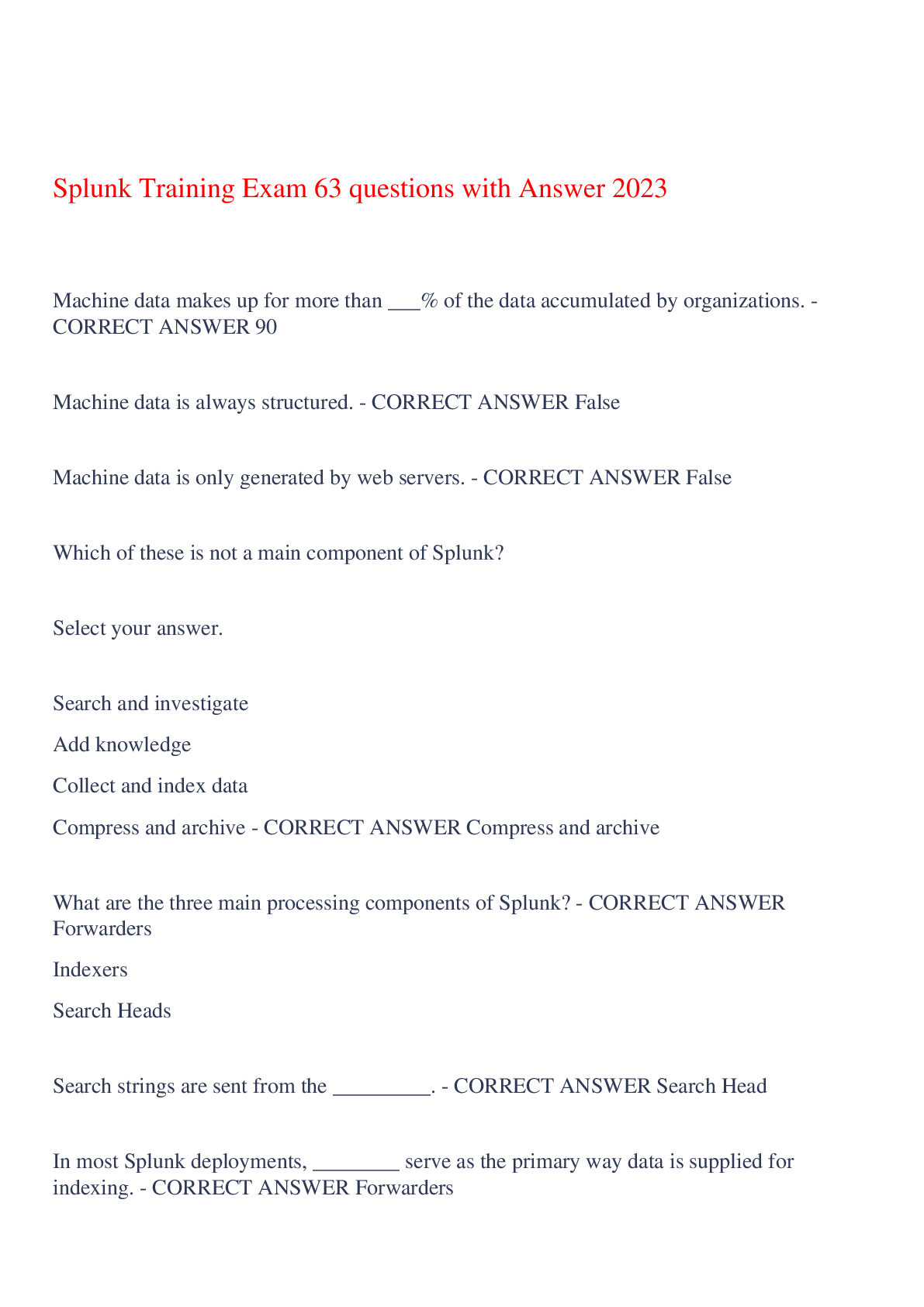 Business > EXAM > Splunk Training Exam 63 questions with Answer 2023,100% CORRECT