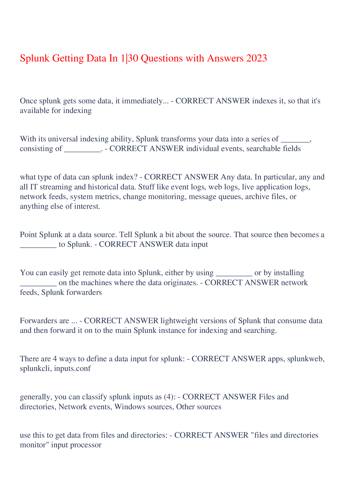 Business > EXAM > Splunk Getting Data In 1|30 Questions with Answers 2023,100% CORRECT