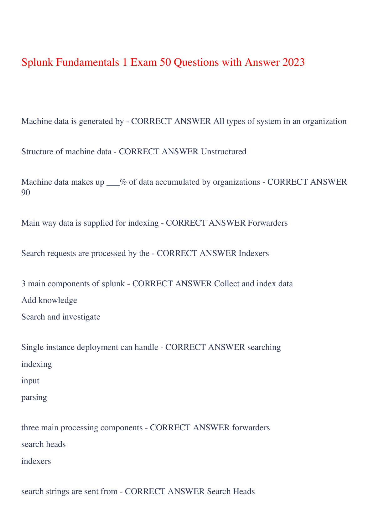 Business > EXAM > Splunk Fundamentals 1 Exam 50 Questions with Answer 2023,100% CORRECT