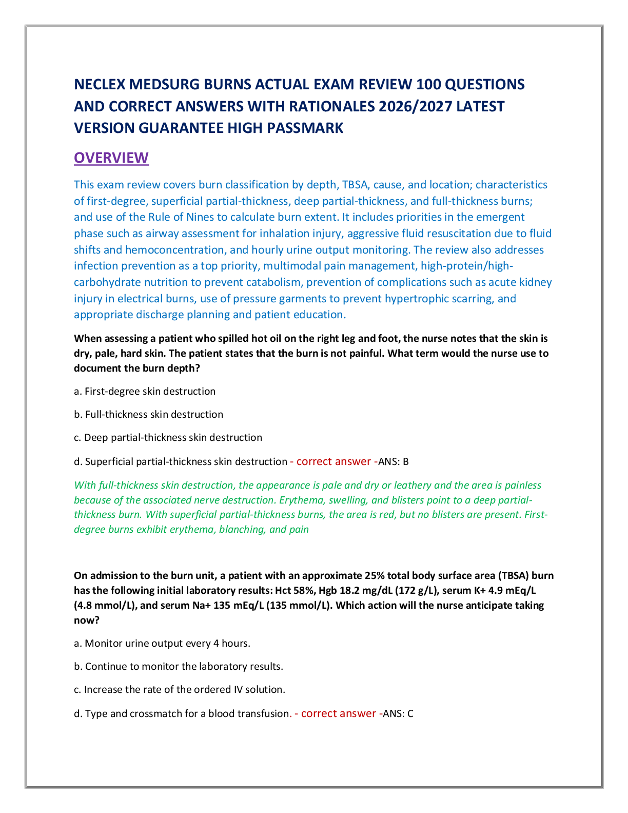 *NURSING > NCLEX > NECLEX MEDSURG BURNS ACTUAL EXAM REVIEW 100 QUESTIONS AND CORRECT ANSWERS WITH RATIONALES 2026/2027 LATEST VERSION GUARANTEE HIGH PASSMARK
