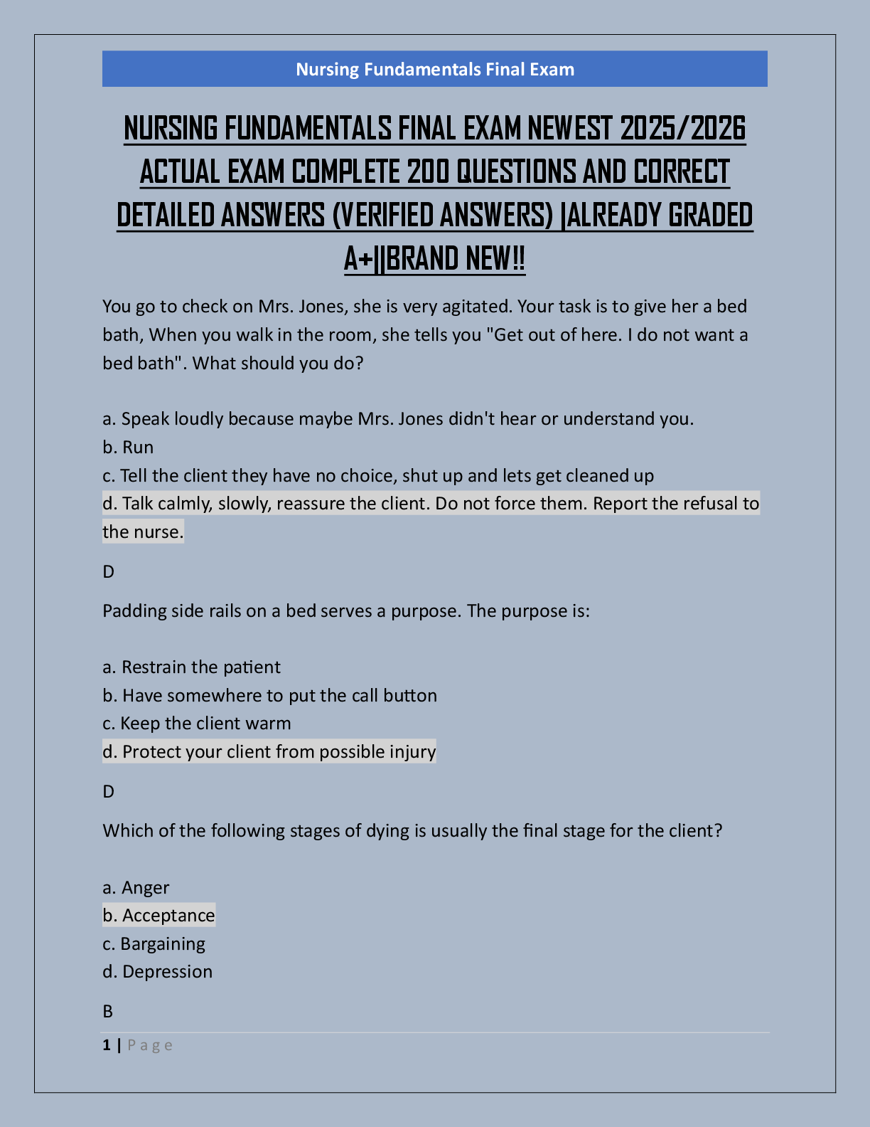 *NURSING > FINAL EXAM > NURSING FUNDAMENTALS FINAL EXAM NEWEST 2025/2026 ACTUAL EXAM COMPLETE 200 QUESTIONS AND CORRECT DETAILED ANSWERS (VERIFIED ANSWERS) |ALREADY GRADED A+||BRAND NEW!!