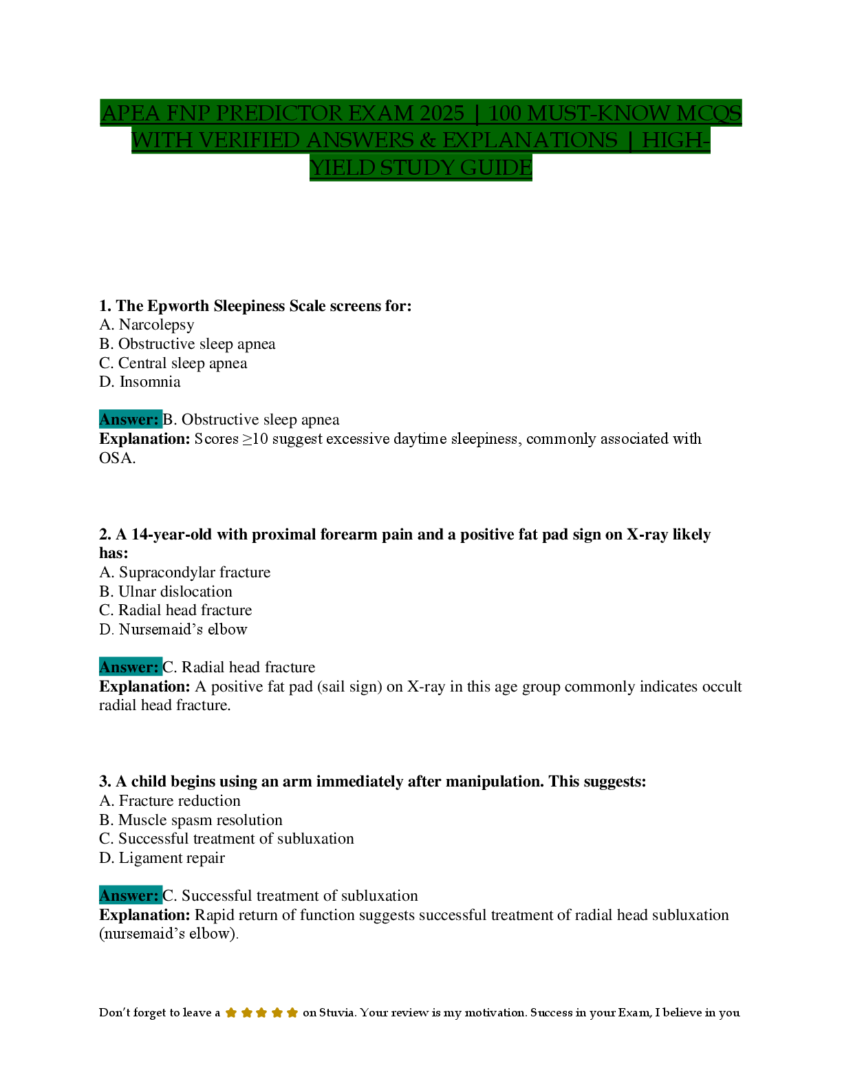 APEA Practice QBank > APEA CERTIFICATION > APEA FNP Predictor Exam 2025 – Family Nurse Practitioner Board Review | Complete High-Yield Question Bank with Pediatric & Adult Assessment Questions