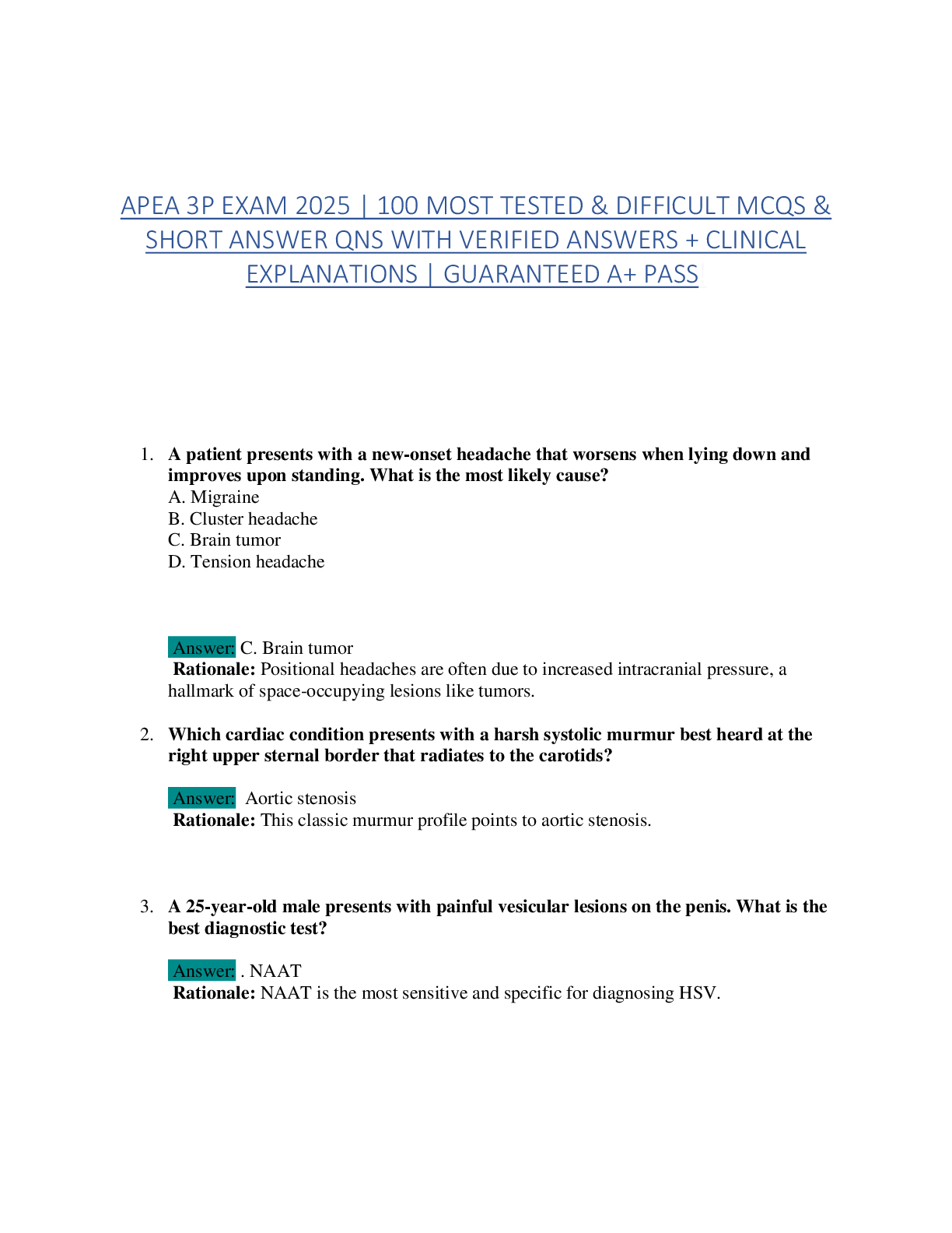 APEA Practice QBank > EXAM REVIEW > APEA 3P Final Exam 2025: Nurse Practitioner (NP) Certification Prep – Complete Test Bank with 100+ Practice Questions & Rationales for FNP, AGNP, PNPC Board Review