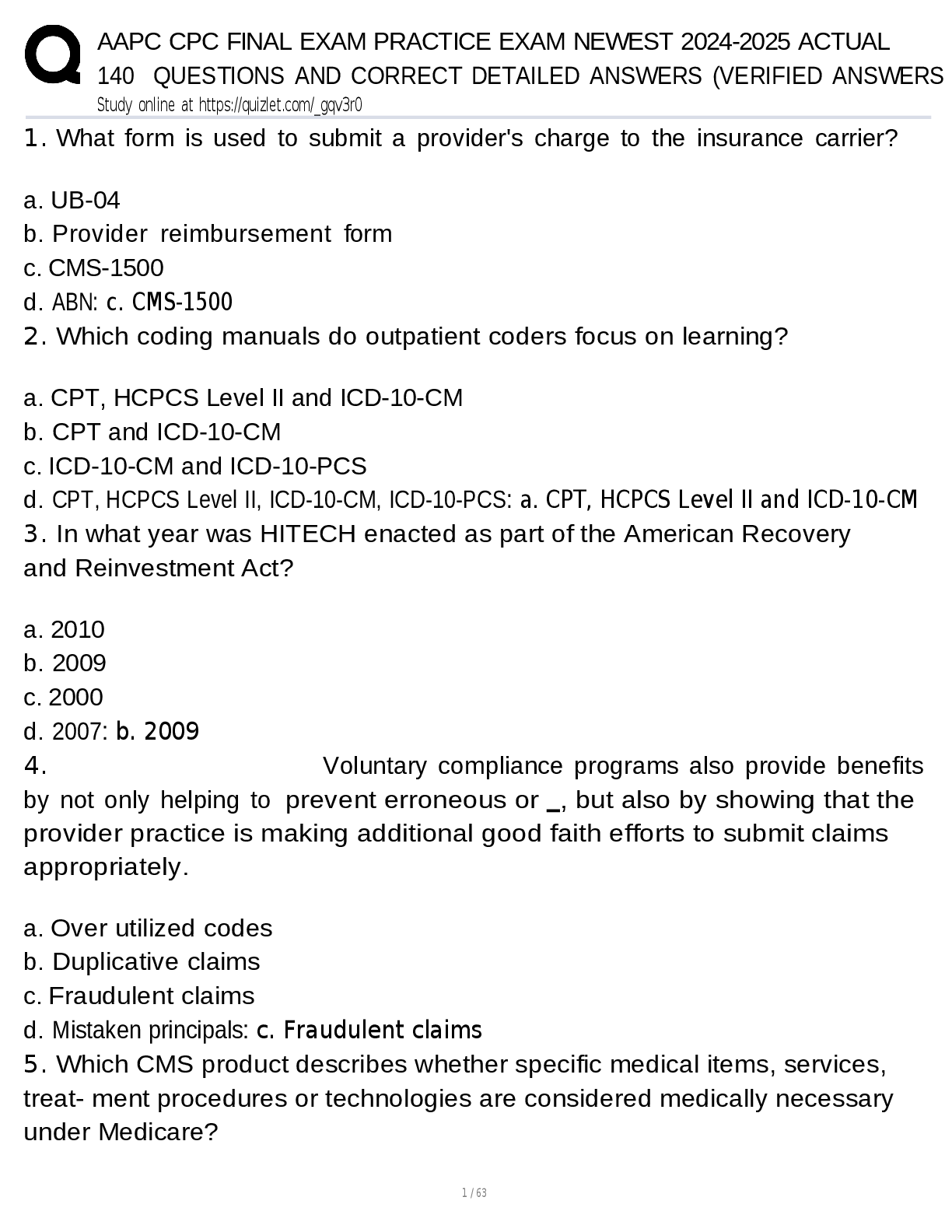 *NURSING > QUESTIONS and ANSWERS > AAPC CPC FINAL EXAM PRACTICE EXAM NEWEST 2024-2025 ACTUAL EXAM 140 QUESTIONS AND CORRECT DETAILED ANSWERS