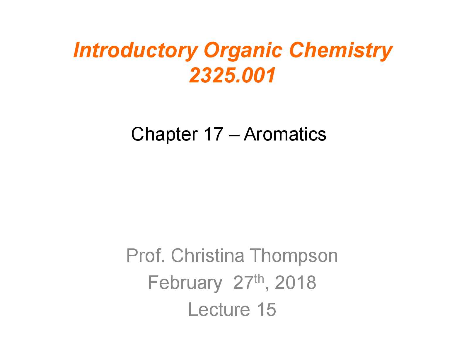 Chemistry > LECTURE SLIDES/NOTES > CHEM 2325 Introductory Organic Chemistry Chapter 17 – Aromatics Lecture 15