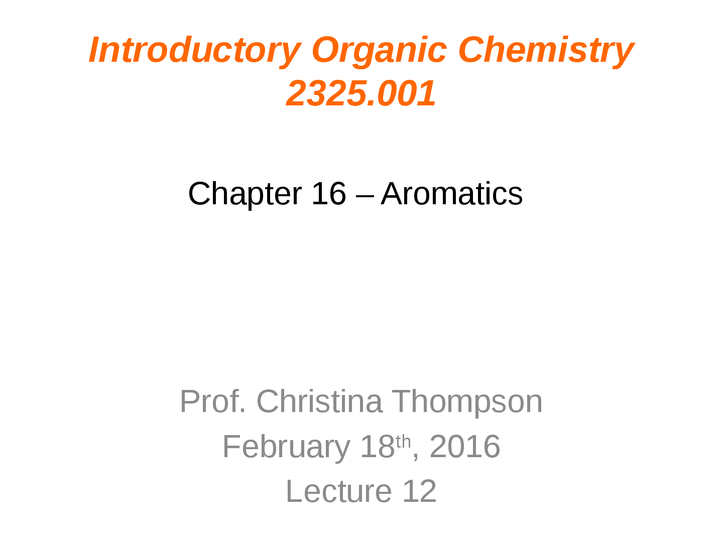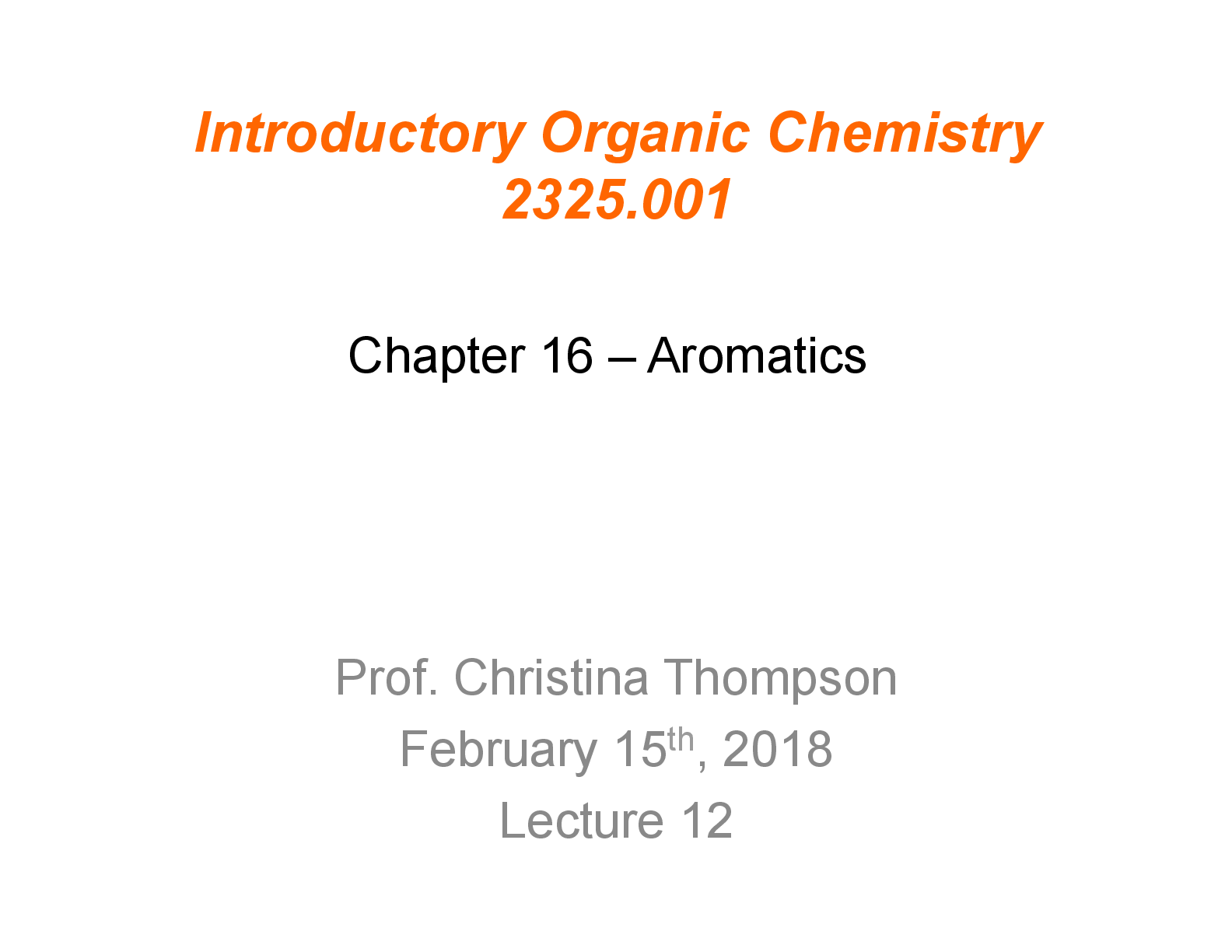 Chemistry > LECTURE SLIDES/NOTES > CHEM 2325 Introductory Organic Chemistry Chapter 16 – Aromatics Lecture 12