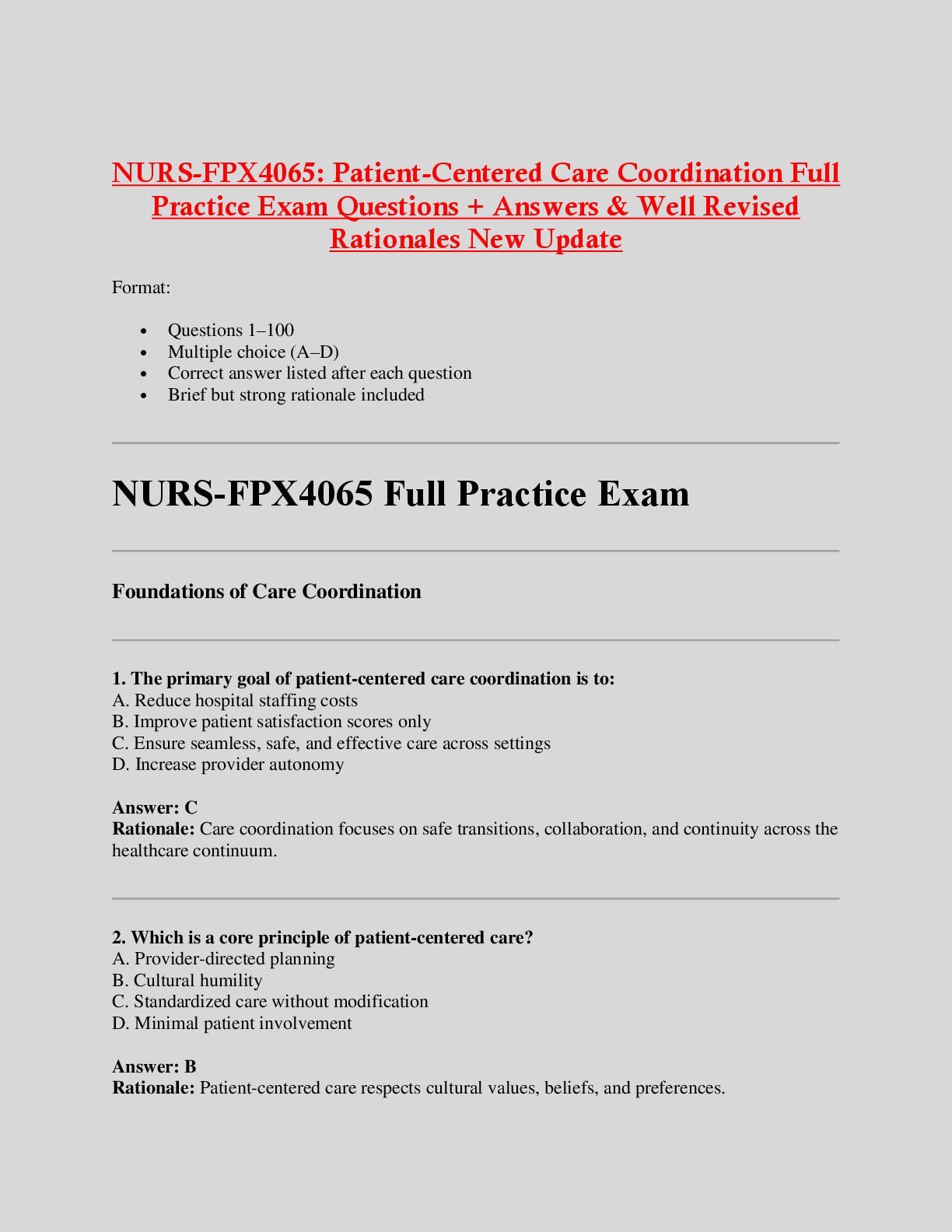 *NURSING > EXAM > NURS-FPX4065: Patient-Centered Care Coordination Full Practice Exam Questions + Answers & Well Revised Rationales New Update