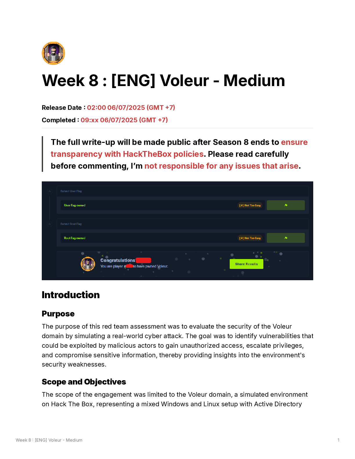 Programming > PROJECT REPORT > Voleur HTB - Sensored Hashes & Password: [ENG] Voleur - Medium; To evaluate the security of the Voleur domain by simulating a real-world cyber attack