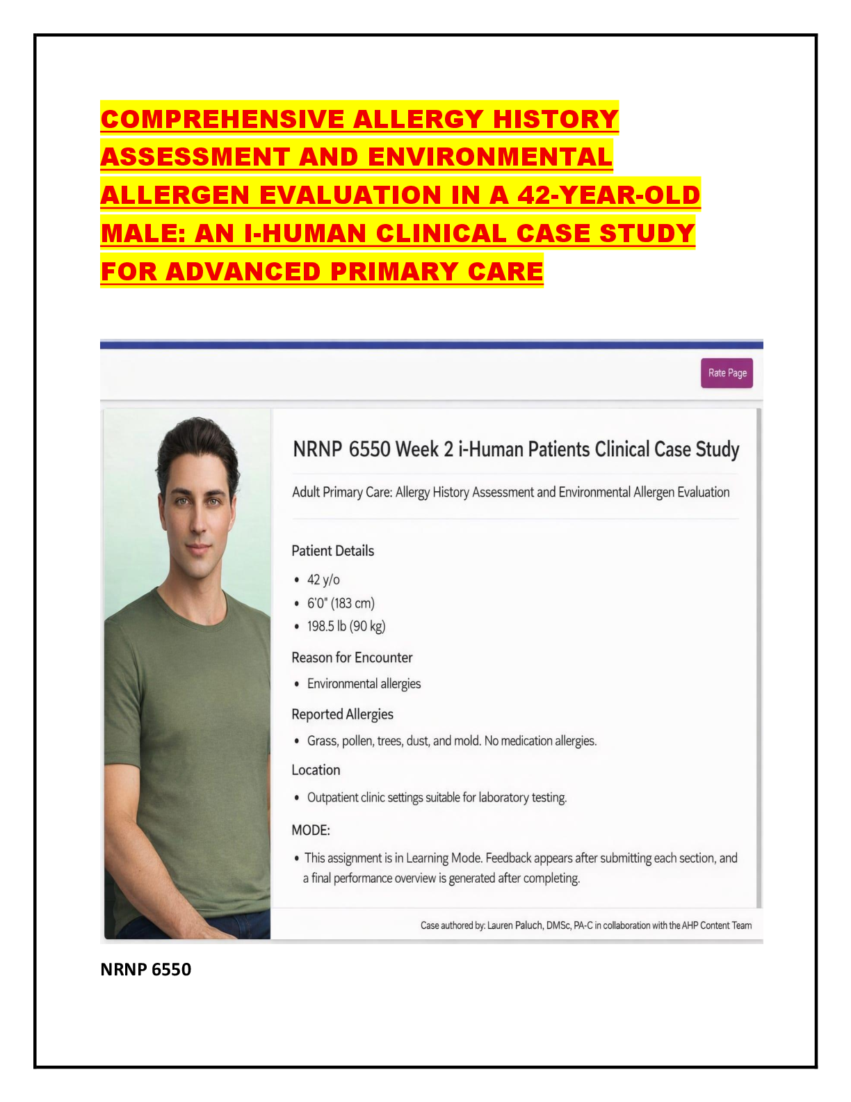 *NURSING > iHuman Case Studies > COMPREHENSIVE ALLERGY HISTORY ASSESSMENT AND ENVIRONMENTAL ALLERGEN EVALUATION IN A 42-YEAR-OLD MALE: AN I-HUMAN CLINICAL CASE STUDY FOR ADVANCED PRIMARY CARE
