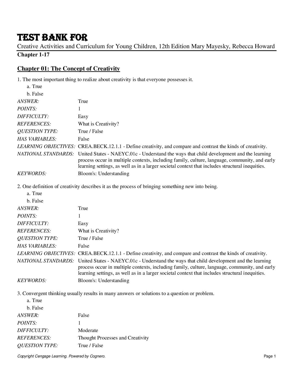 Business > TEST BANKS > Test Bank For Creative Activities and Curriculum for Young Children, 12th Edition by Mary Mayesky, Rebecca Howard Chapter 1-17