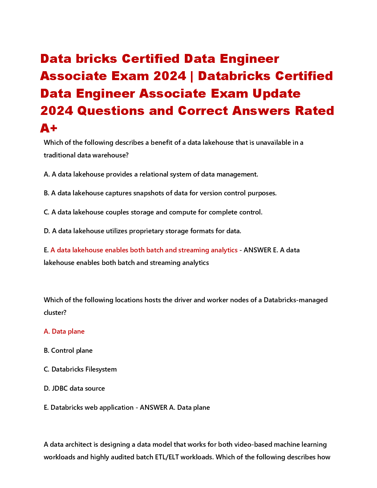*NURSING > EXAM > Data bricks Certified Data Engineer Associate Exam 2024 | Databricks Certified Data Engineer Associate Exam Update 2024 Questions and Correct Answers Rated A+
