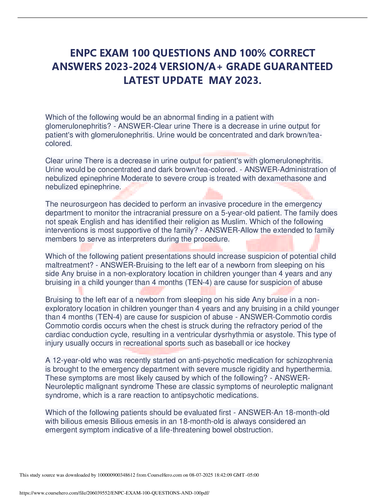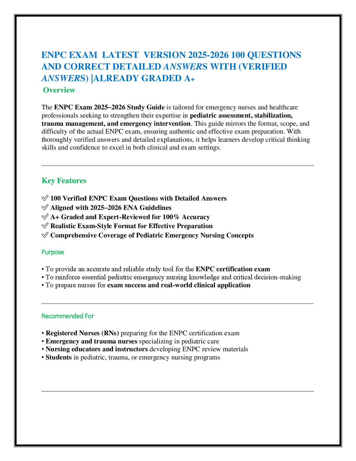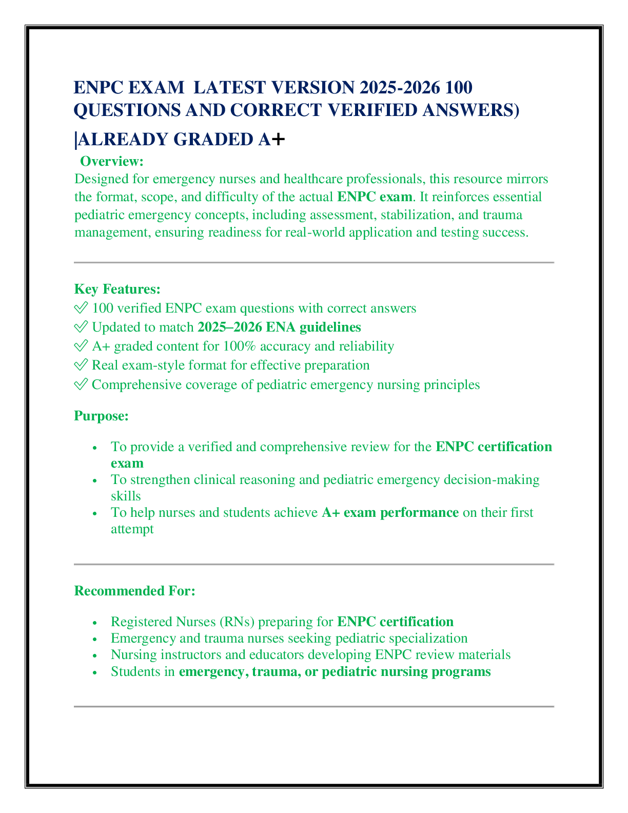 *NURSING > EXAM > ENPC EXAM LATEST VERSION 2025-2026 100 QUESTIONS AND CORRECT VERIFIED ANSWERS) |ALREADY GRADED A+