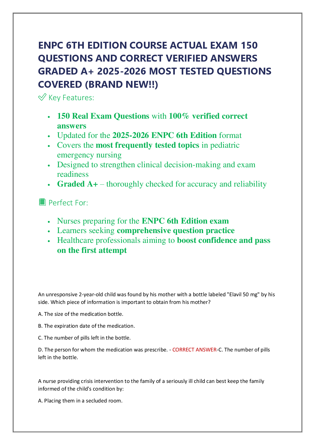 *NURSING > EXAM > ENPC Exam 100 Questions and Answers: 2025-2026 Edition - A+ Grade Guaranteed