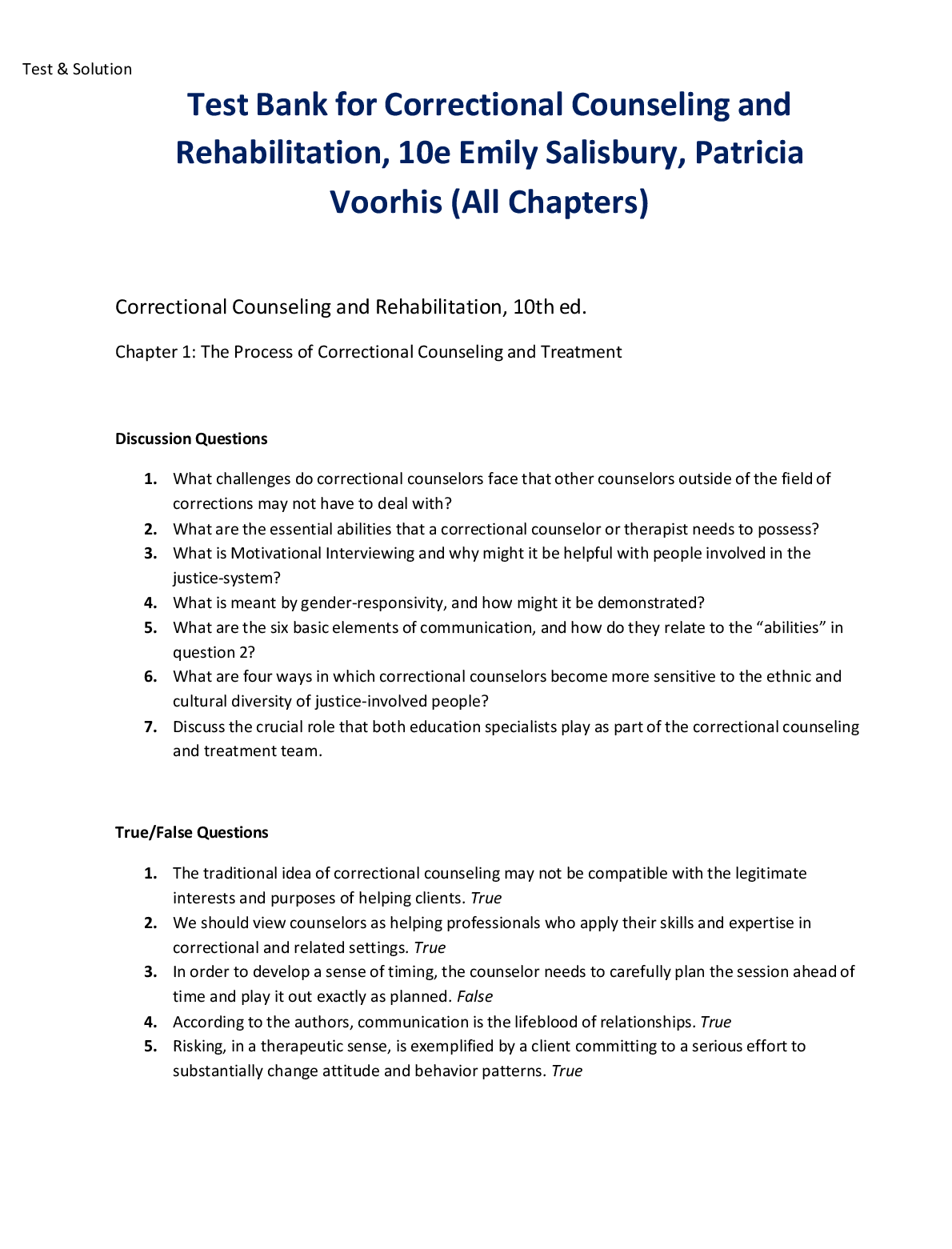 Counseling > TEST BANKS > Test Bank for Correctional Counseling and Rehabilitation, 10e Emily Salisbury, Patricia Voorhis (All Chapters)