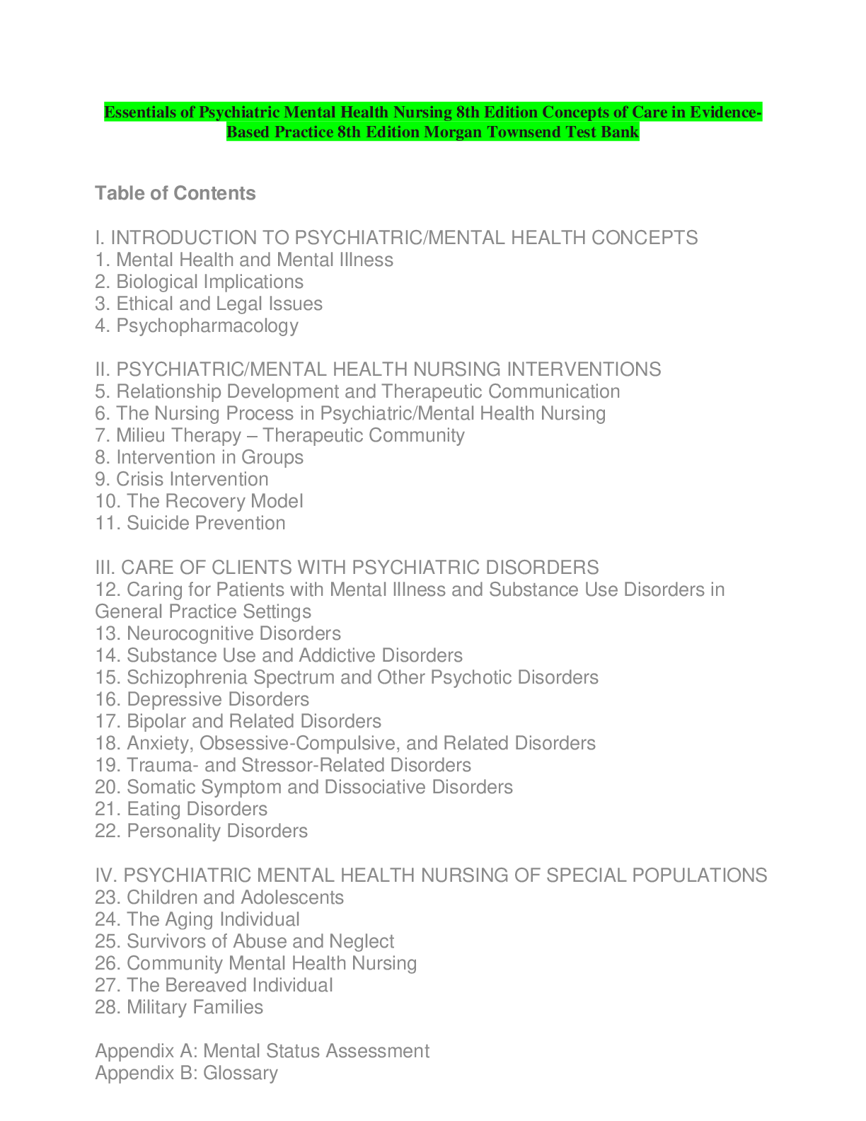 *NURSING > TEST BANKS > Essentials of Psychiatric Mental Health Nursing 8th Edition Concepts of Care in EvidenceBased Practice 8th Edition Morgan Townsend Test Bank