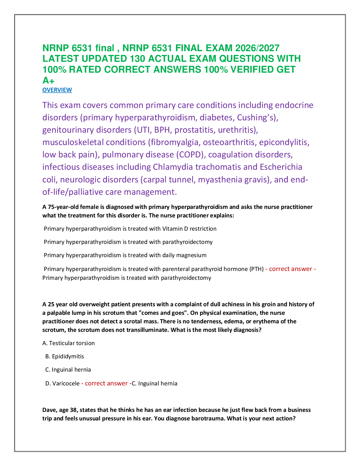 *NURSING > EXAM REVIEW > NRNP 6531 final , NRNP 6531 FINAL EXAM 2026/2027 LATEST UPDATED 130 ACTUAL EXAM QUESTIONS WITH 100% RATED CORRECT ANSWERS 100% VERIFIED GET A+