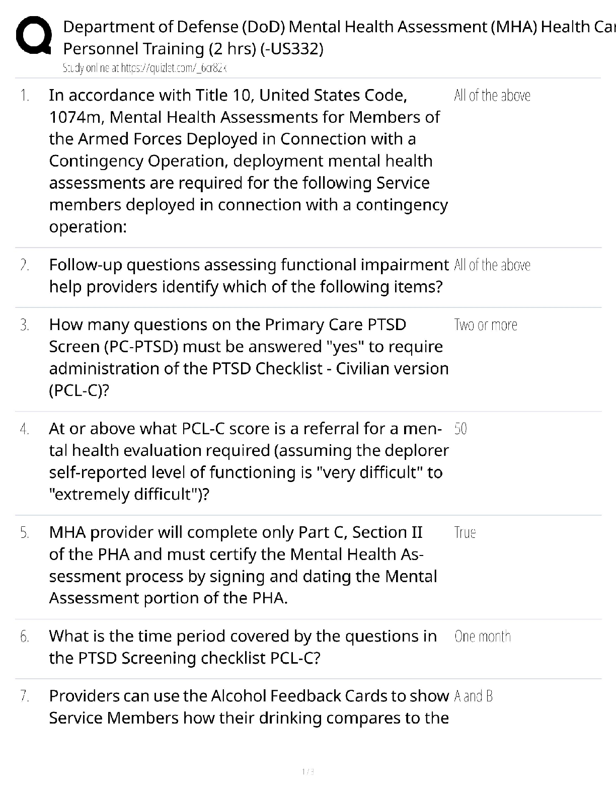 Health Care > QUESTIONS & ANSWERS > DoD MHA Training US332 / Mental Health Assessment Healthcare Personnel / 2026 JKO Exam Prep / Score 100%