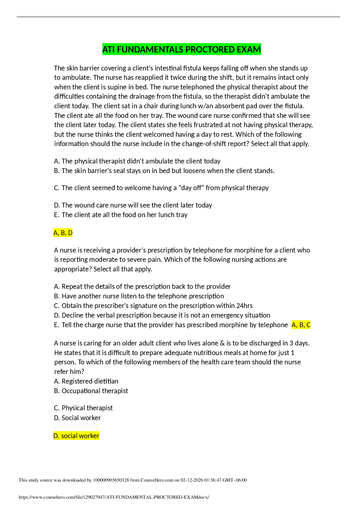 *NURSING > EXAM > ATI FUNDAMENTALS PROCTORED EXAM