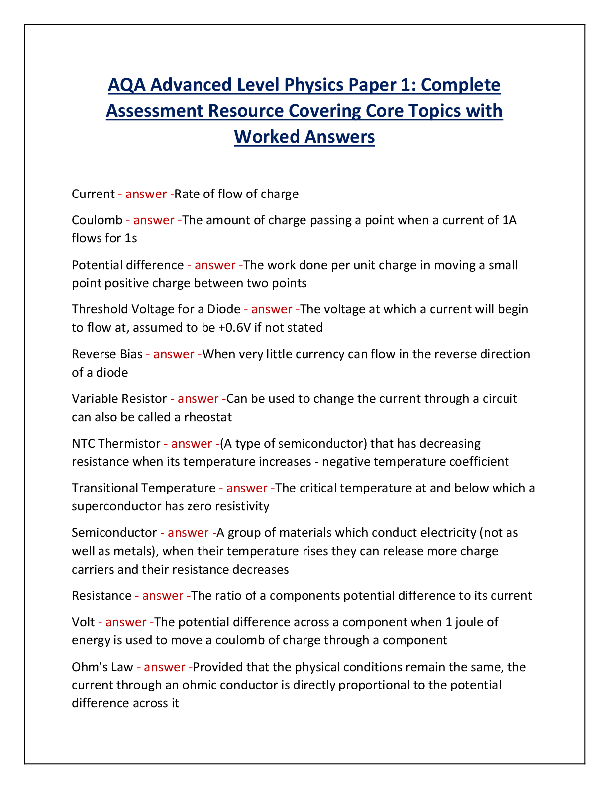 Physics > A-Level Mark Scheme > AQA Advanced Level Physics Paper 1: Complete Assessment Resource Covering Core Topics with Worked Answers