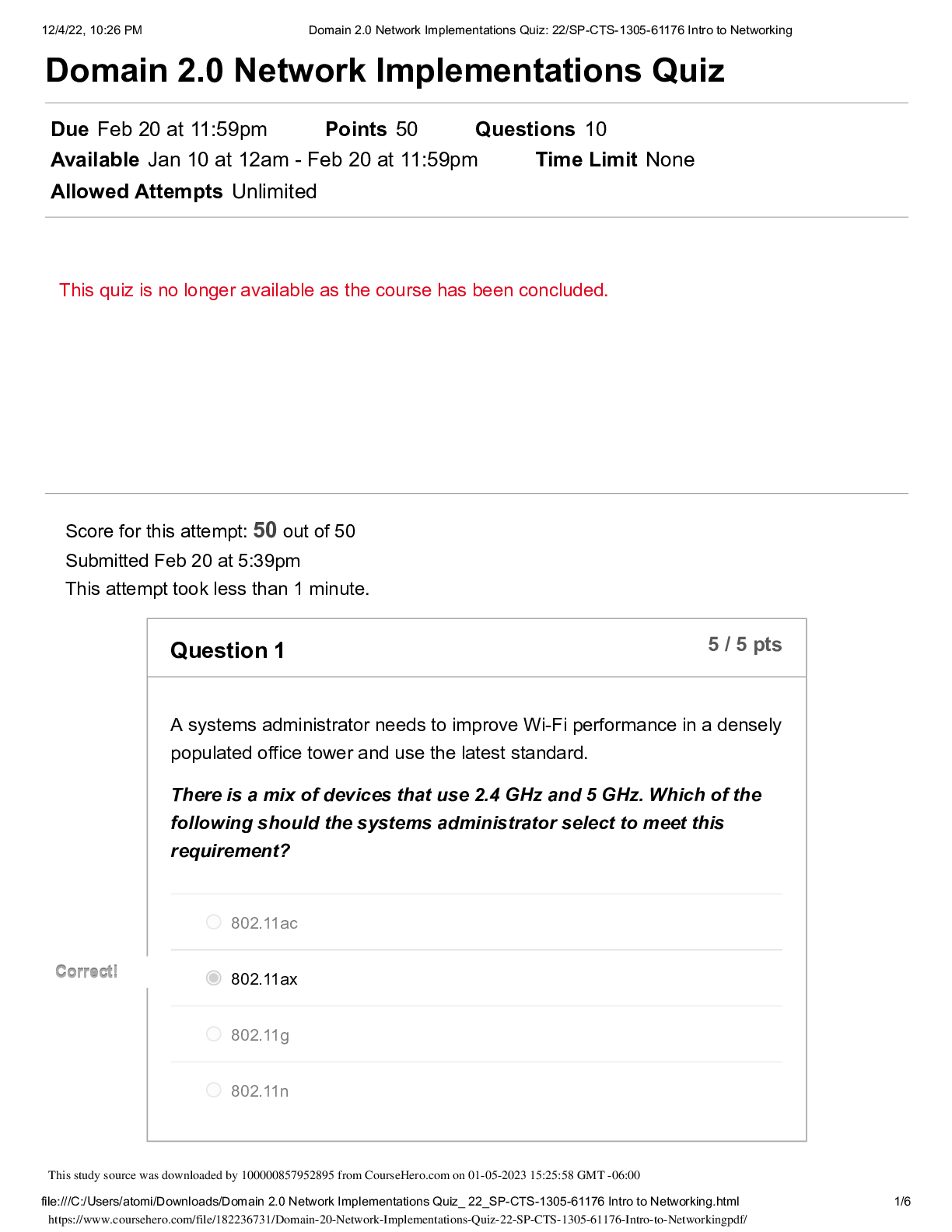 Computer Networking > QUESTIONS & ANSWERS > Questions and Answers > Domain 2.0 Network Implementations Quiz_ 22_SP-CTS-1305-61176 Intro to Networking _ CTS 1305. Score for this attempt: 50 out of 50.