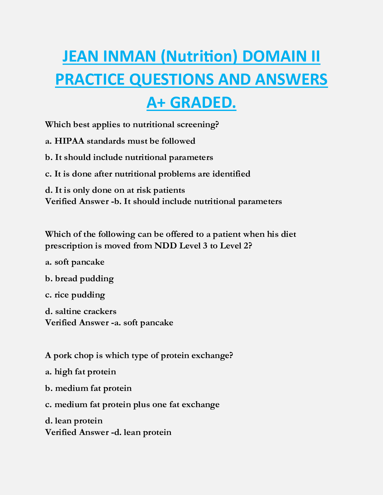 *NURSING > EXAM > JEAN INMAN (Nutrition) DOMAIN II PRACTICE QUESTIONS AND ANSWERS A+ GRADED.