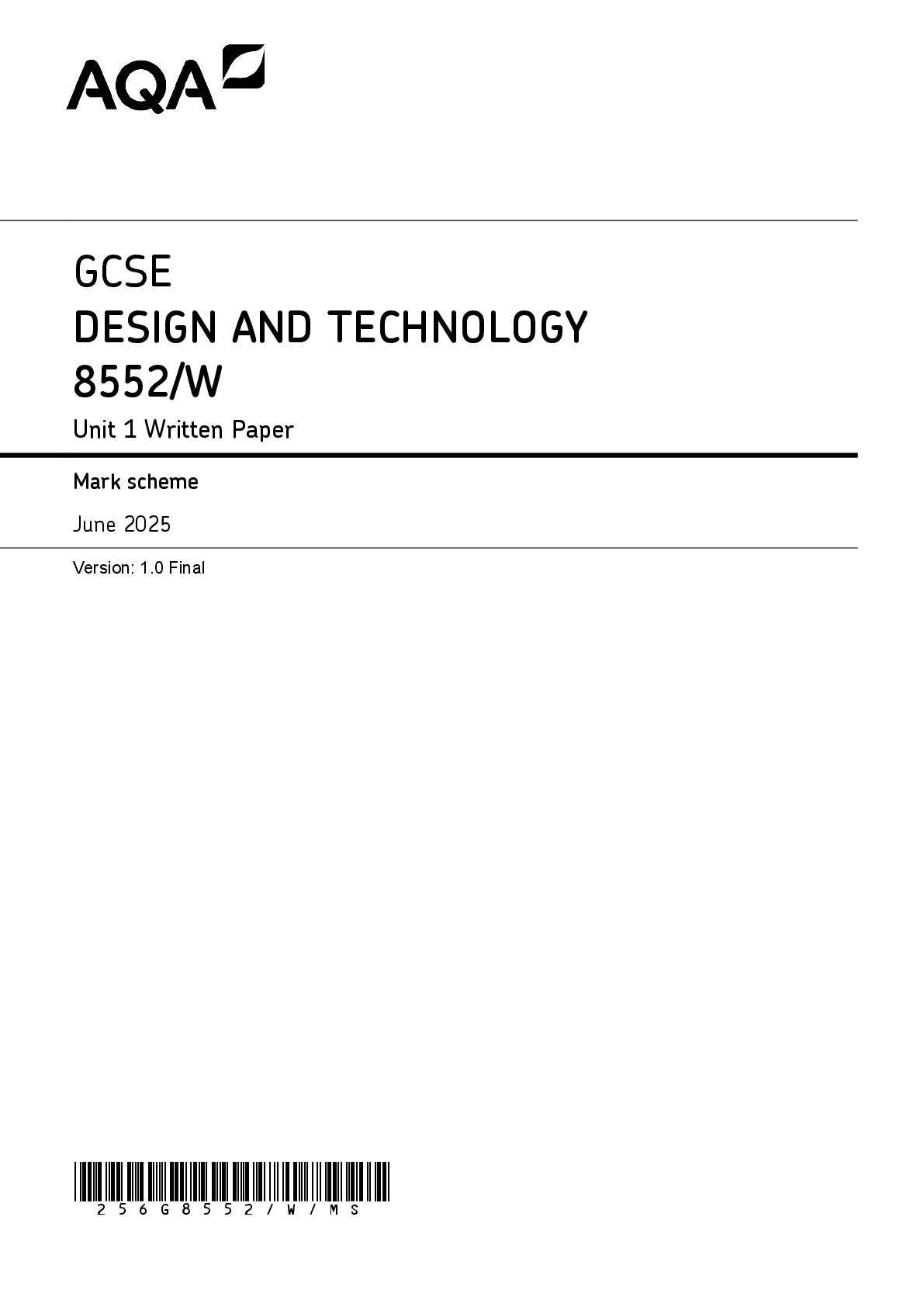 Design and Technology > GCSE MARK SCHEME > 2025 AQA GCSE DESIGN AND TECHNOLOGY PAPER 1 MARK SCHEME 8552/W