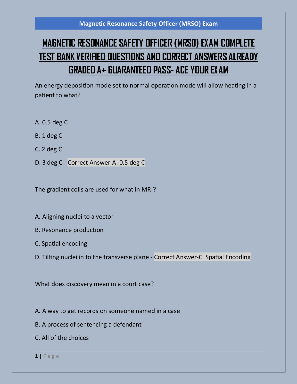 Radiology > EXAM > MAGNETIC RESONANCE SAFETY OFFICER (MRSO) EXAM COMPLETE TEST BANK VERIFIED QUESTIONS AND CORRECT ANSWERS ALREADY GRADED A+ GUARANTEED PASS- ACE YOUR EXAM