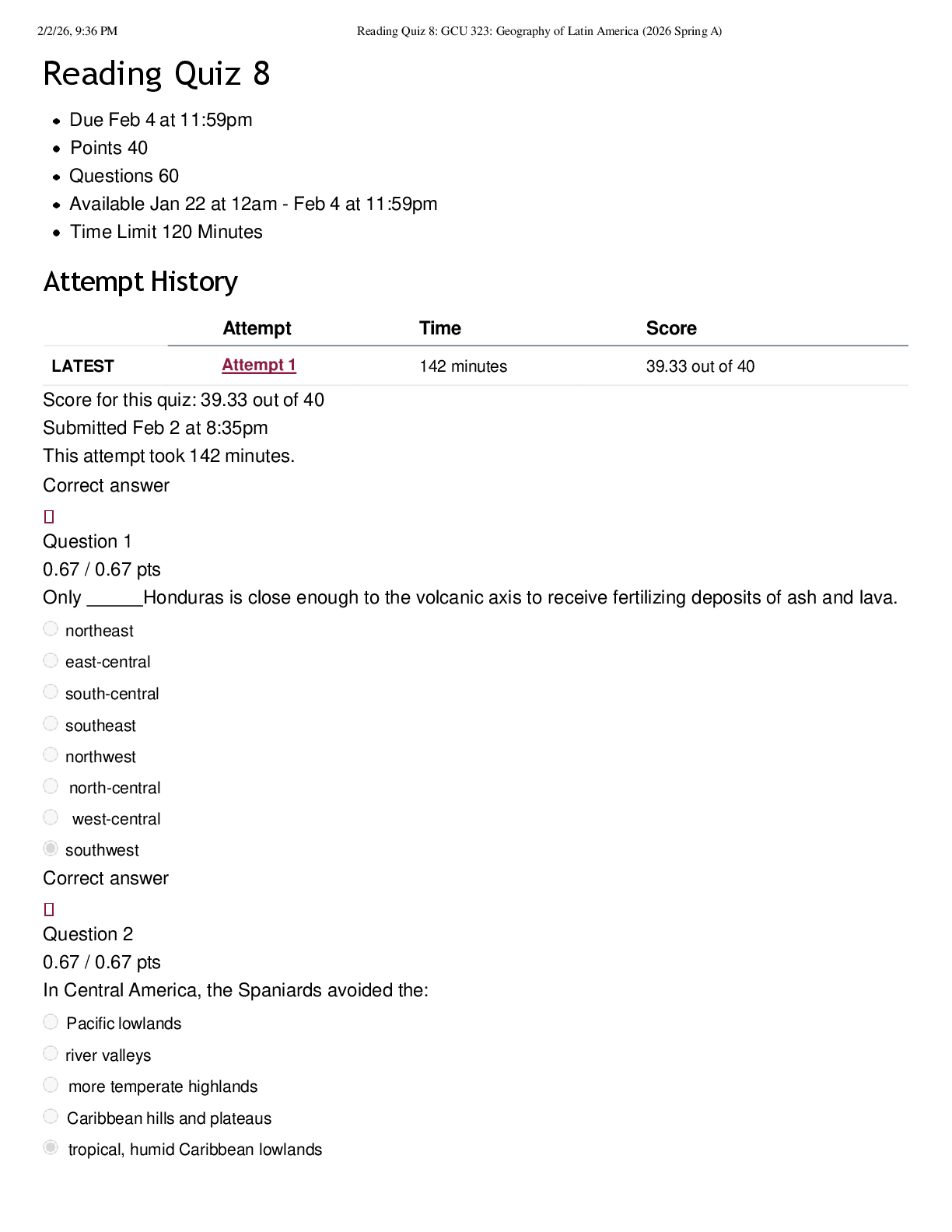 Geography > EXAM > GCU 323 Reading Quiz 8 | Score 39.33/40 | Arizona State University
