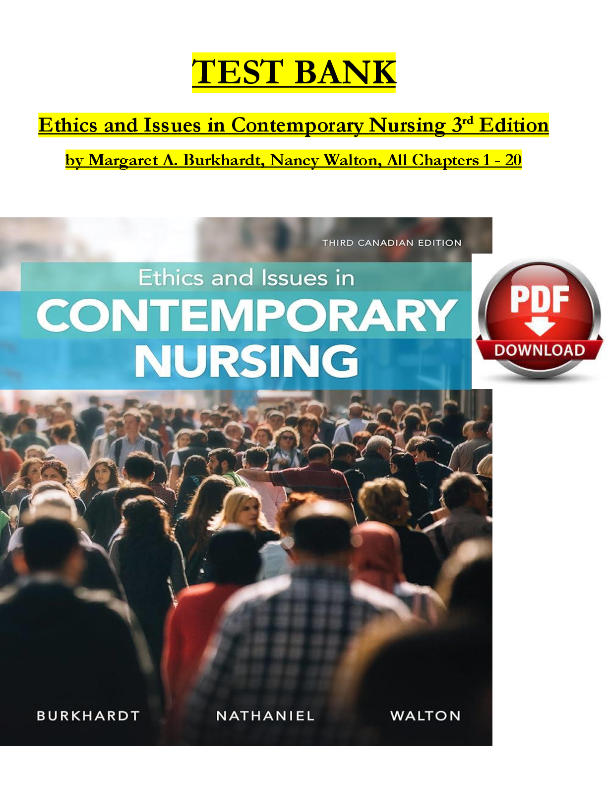 nursing fundamentals > TEST BANKS > Test Bank for Ethics and Issues in Contemporary Nursing, 3rd Canadian Edition by Margaret A. Burkhardt, Nancy Walton & Alvita K. Nathaniel | ISBN: 9780176696573 | Complete Chapters 1-20 | Multiple-Choice Questions with Answers | Downloadable PDF