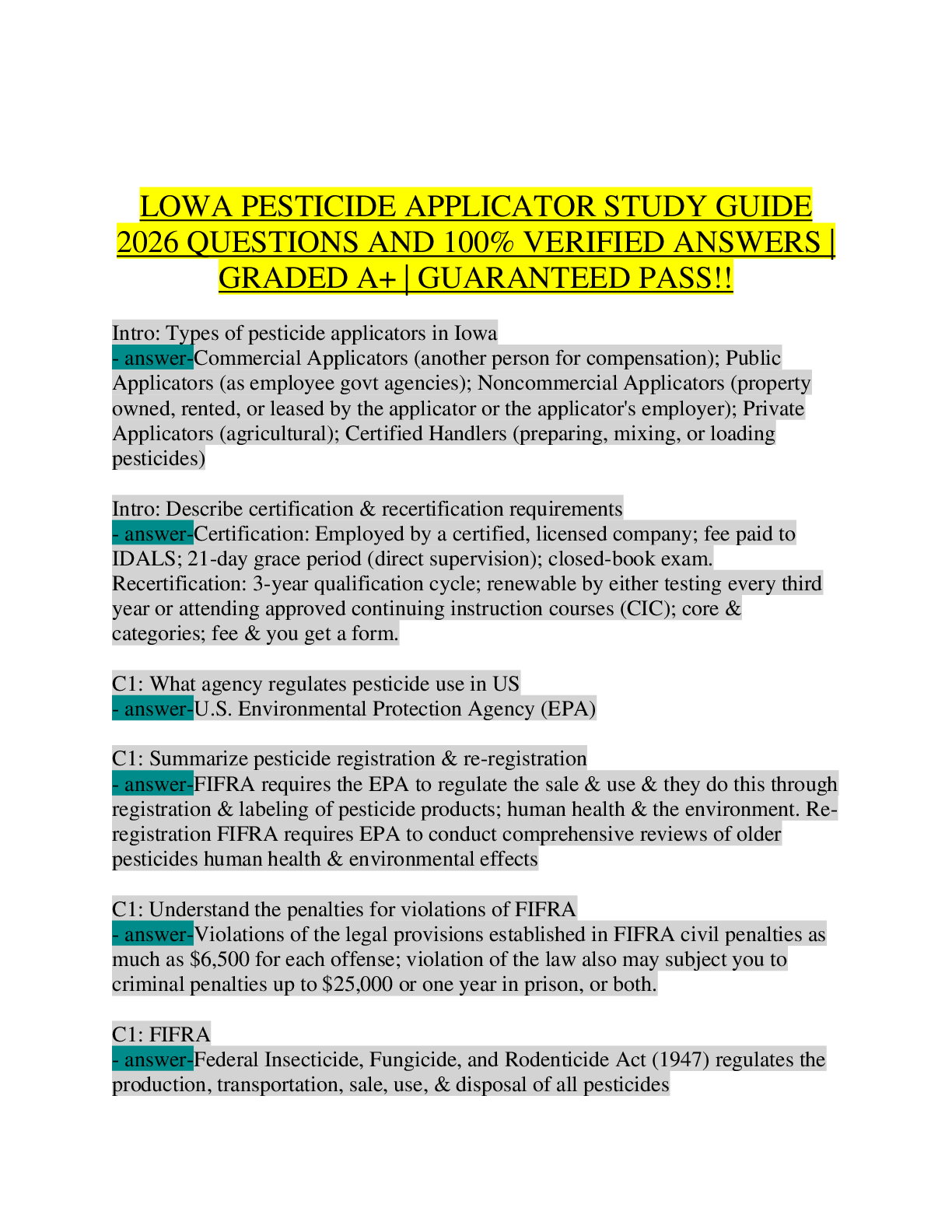 Pesticide License > STUDY GUIDE > Iowa Pesticide Applicator CORE Study Guide 2026 | Complete Exam Prep with 200+ Questions and 100% Verified Answers | IDALS Commercial, Public, Noncommercial, and Private Certification | FIFRA, WPS, IPM, PPE, Calibration Math, and Iowa-Specific Laws