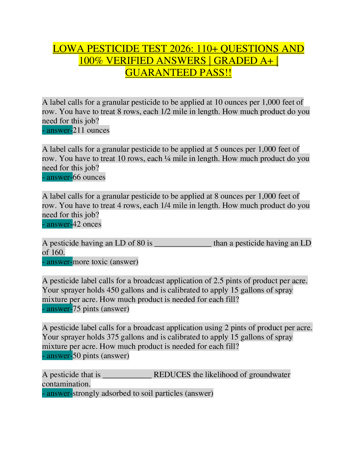 Pesticide License > STUDY GUIDE > Iowa Pesticide Applicator CORE Exam 2026 | Complete Test Bank with 150+ Questions and 100% Verified Answers | IDALS Commercial, Public, Noncommercial, and Private Certification Prep | Application Math, Label Interpretation, Laws, PPE, and Drift Control