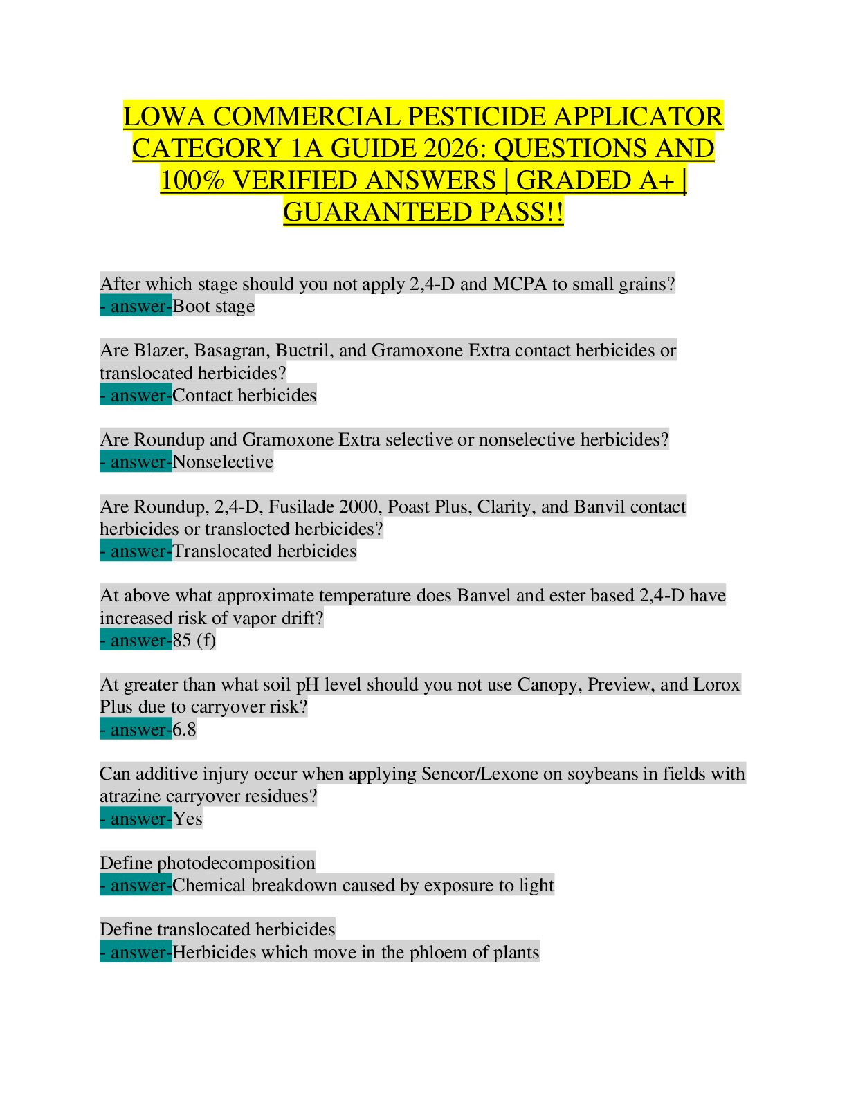 Pesticide License > STUDY GUIDE > Iowa Commercial Pesticide Applicator Category 1A Exam 2026 | Agricultural Pest Control (Crops) Complete Study Guide | Questions with 100% Verified Answers | IDALS Category 1A Certification Prep | Herbicide Modes of Action, Drift Control, Crop Rotation, and Application Timing
