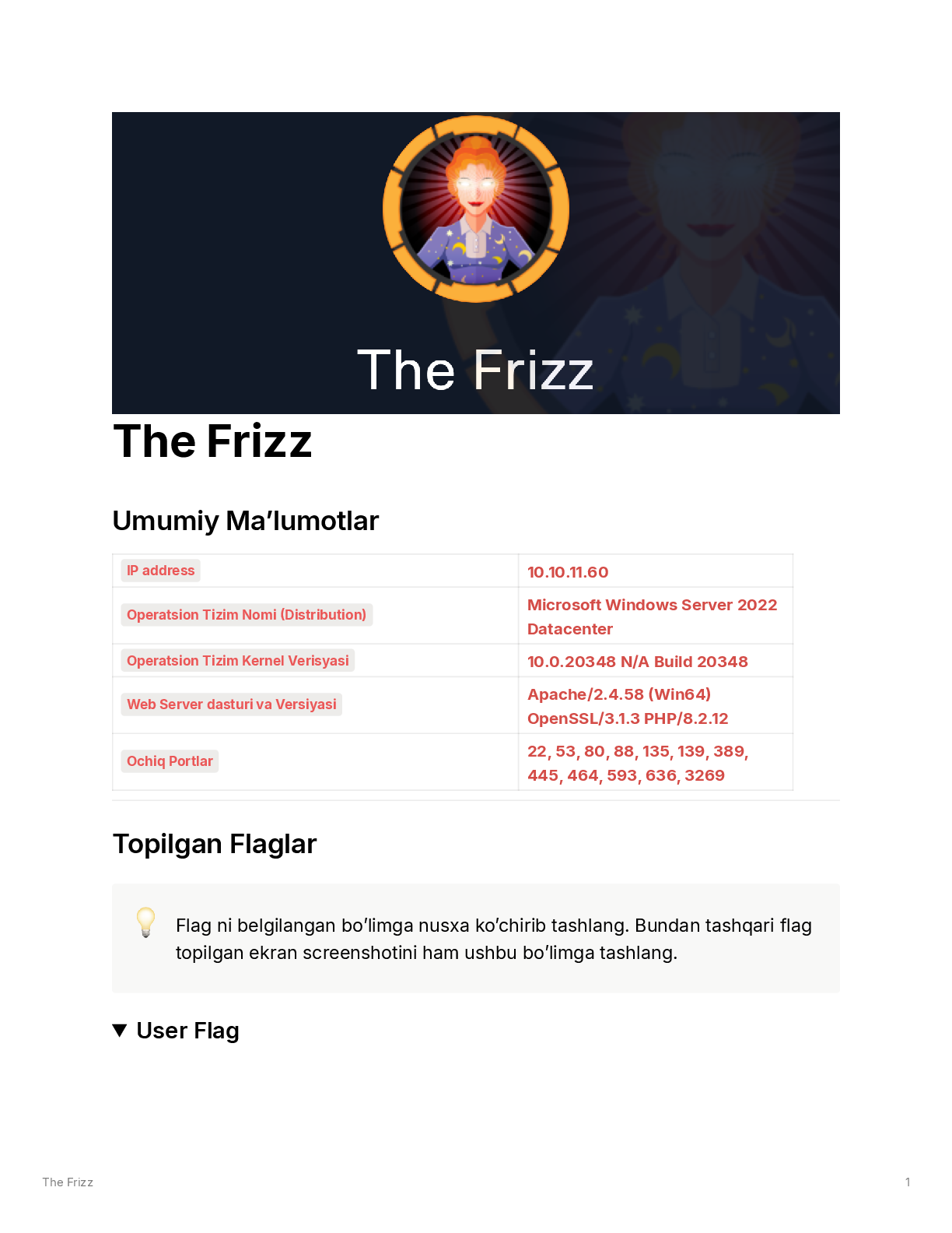 ProgrammingGUIDELINES  > CYBER 2025 The Frizz Umumiy Ma’lumotlar: Topilgan Flaglar User Flag, Root Flag