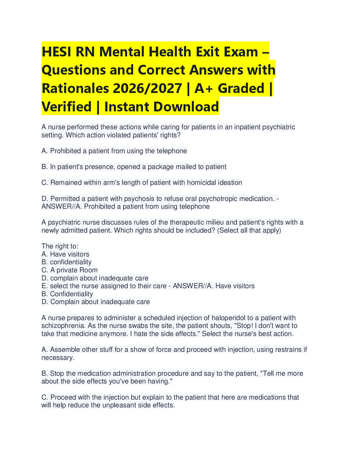 HESI Mental Health > A-Level Question Paper > HESI Exit Exam Comprehensive Study Guide – Tested Questions and Detailed Answers with Rationales (Verified Answers, Graded A+)