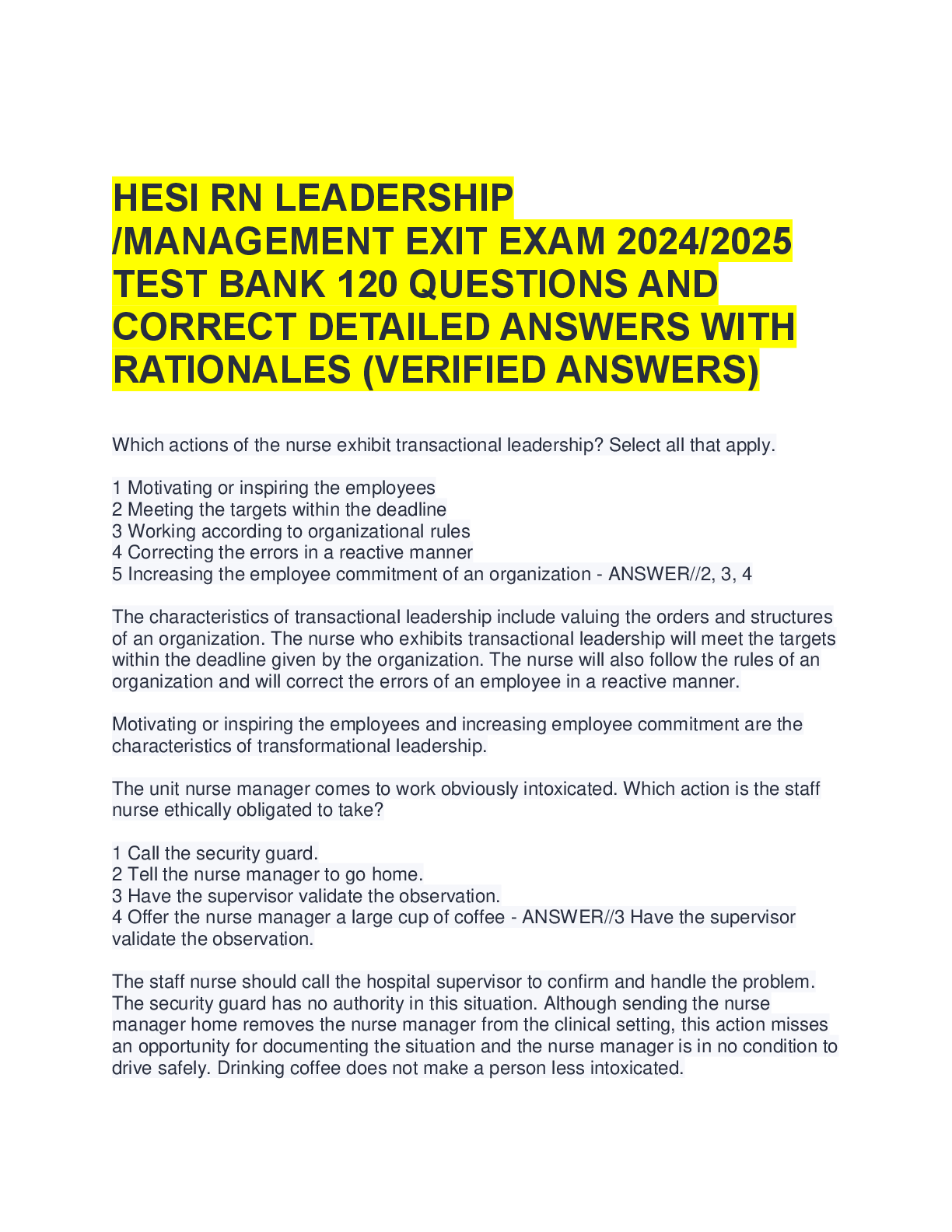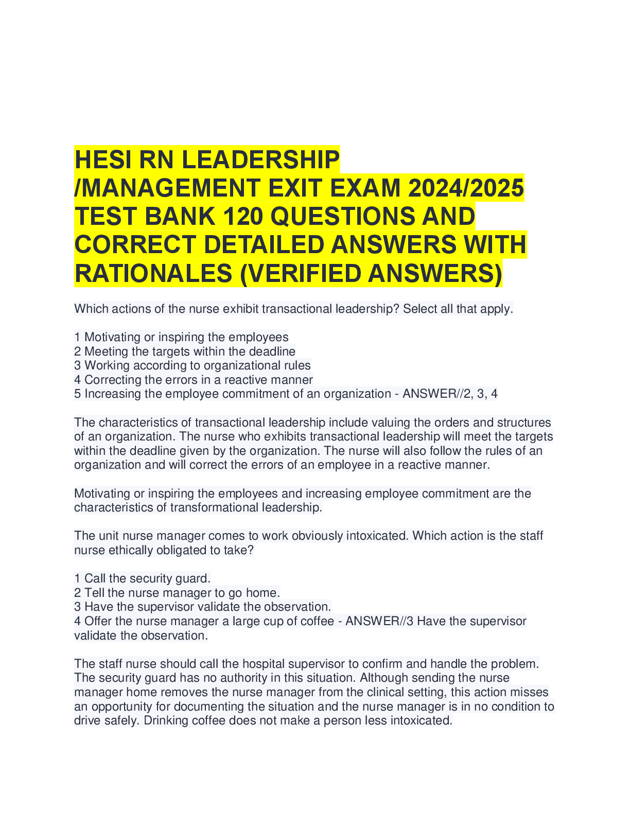 HESI LEADERSHIP EXIT > A-Level Question Paper > HESI RN Leadership Exam – Comprehensive Practice Questions and Correct Answers with Rationales | A+ Graded Study Guide