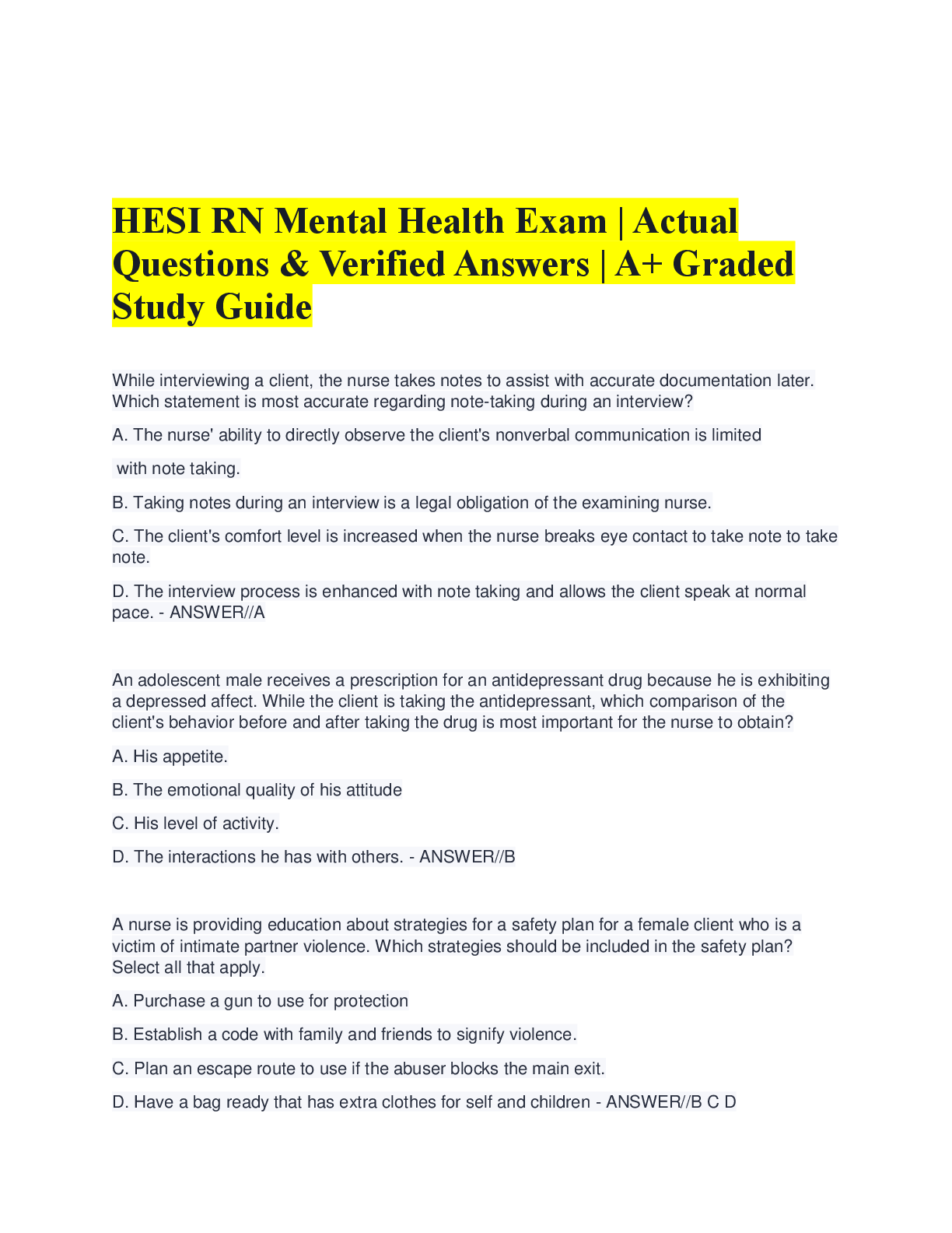 HESI Mental Health > A-Level Question Paper > HESI RN Mental Health Exam – Actual Questions & Verified Answers | A+ Graded Study Guide