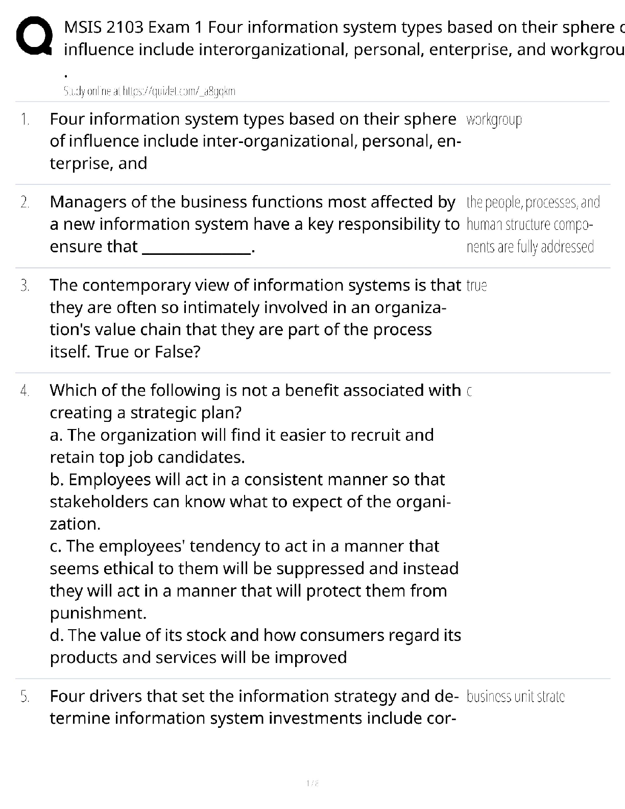 Information Systems Management > QUESTIONS & ANSWERS > MSIS 2103 Exam 1 / Four Information System Types / Score 100% (Study Guide)