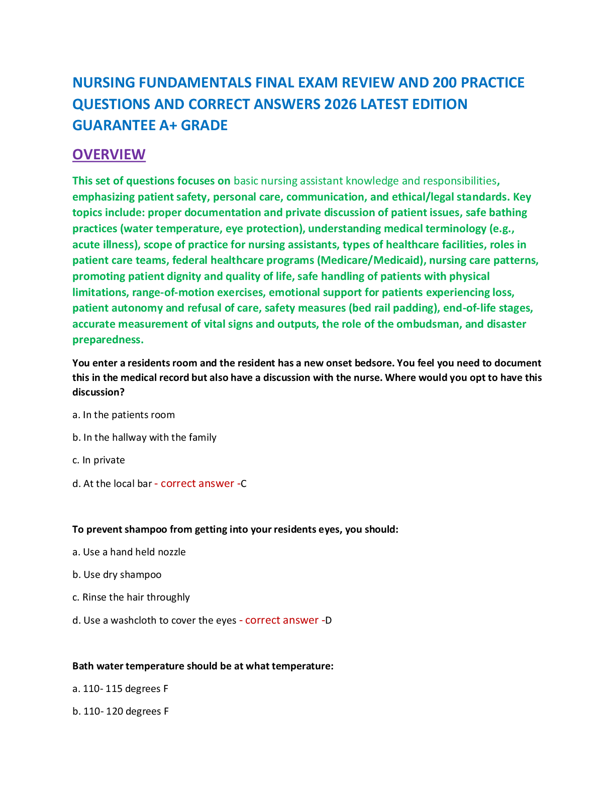 *NURSING > FINAL EXAM > NURSING FUNDAMENTALS FINAL EXAM REVIEW AND 200 PRACTICE QUESTIONS AND CORRECT ANSWERS 2026 LATEST EDITION GUARANTEE A+ GRADE