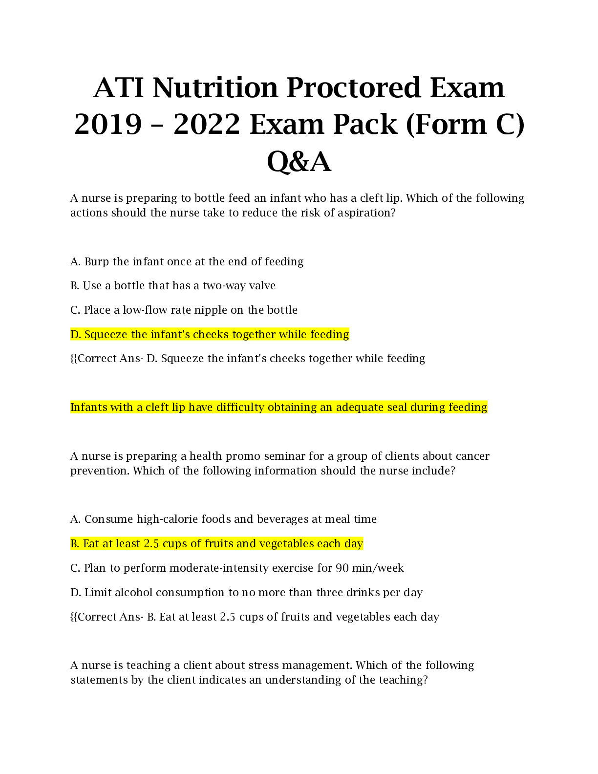 *NURSING > EXAM > ATI Nutrition Proctored Exam 2019 – 2022 Exam Pack (Form C) Q&A | Finest Pull together for 2023 Test