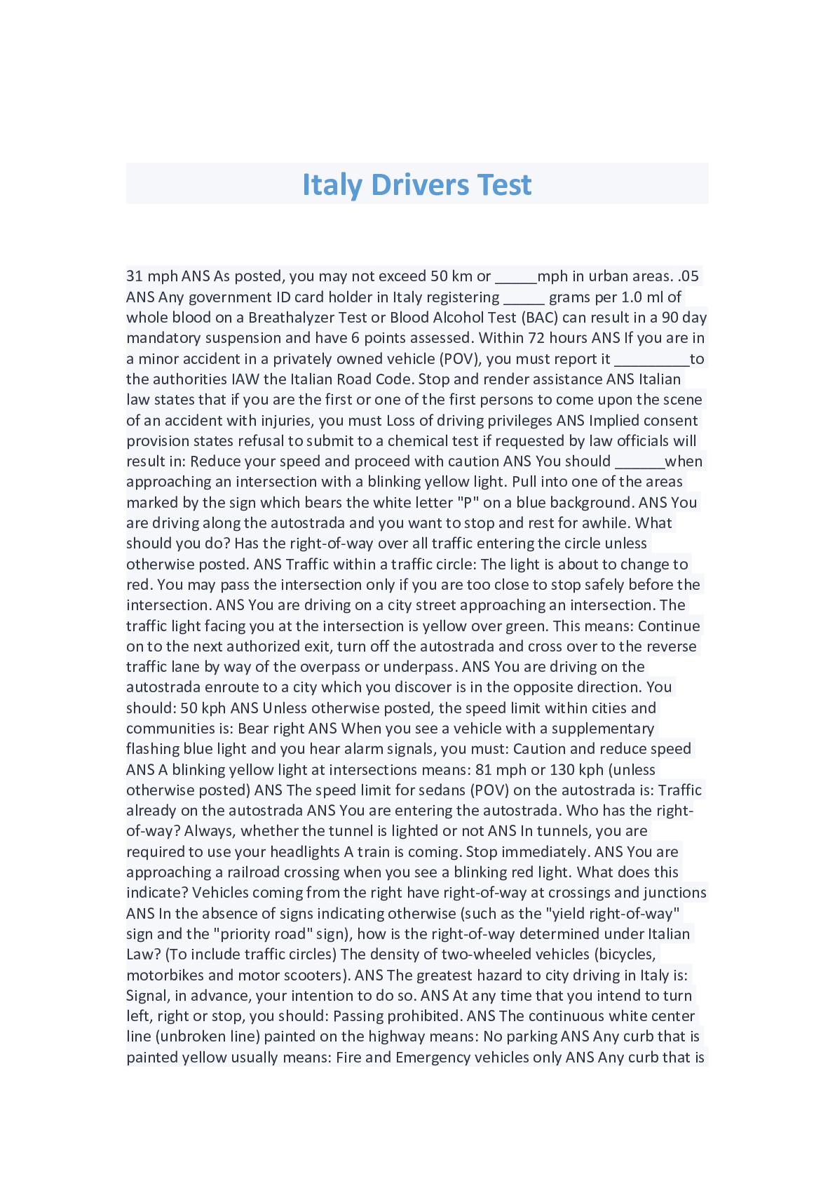 Military Studies > EXAM > Italy Drivers Test 31 mph ANS As posted, you may not exceed 50 km or _____mph in urban areas. .05 ANS Any government ID card holder in Italy registering _____ grams per 1.0 ml of whole blood on a Breathalyzer Test or Blood Alcohol Test (BAC) can result in a 90 day mandatory suspension and have 6 points assessed. Within 72 hours ANS If you are in a minor accident in a privately owned vehicle (POV), you must report it _________to the authorities IAW the Italian Road Code. Stop and render assistance ANS Italian law states that if you are the first or one of the first persons to come upon the scene of an accident with injuries, you must Loss of driving privileges ANS Implied consent provision states refusal to submit to a chemical test if requested by law officials will result in: Reduce your speed and proceed with caution ANS You should ______when approaching an intersection with a blinking yellow light. Pull into one of the areas marked by the sign which bears the white letter "P" on a blue background. ANS You are driving along the autostrada and you want to stop and rest for awhile. What should you do? Has the right-of-way over all traffic entering the circle unless otherwise posted. ANS Traffic within a traffic circle: The light is about to change to red. You may pass the intersection only if you are too close to stop safely before the intersection. ANS You are driving on a city street approaching an intersection. The traffic light facing you at the intersection is yellow over green. This means: Continue on to the next authorized exit, turn off the autostrada and cross over to the reverse traffic lane by way of the overpass or underpass. ANS You are driving on the autostrada enroute to a city which you discover is in the opposite direction