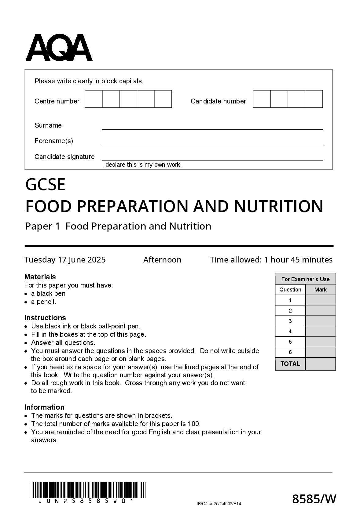 Food and Nutrition > GCSE QUESTION PAPER > 2025 AQA GCSE FOOD PREPARATION AND NUTRITION PAPER 1 8585/W