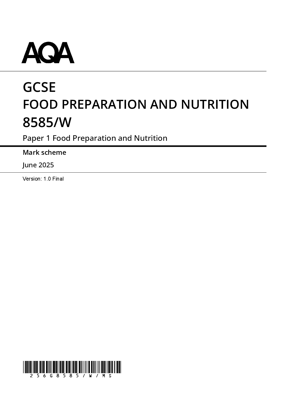 Food and Nutrition > GCSE MARK SCHEME > 2025 AQA GCSE FOOD PREPARATION AND NUTRITION PAPER 1 MARK SCHEME 8585/W