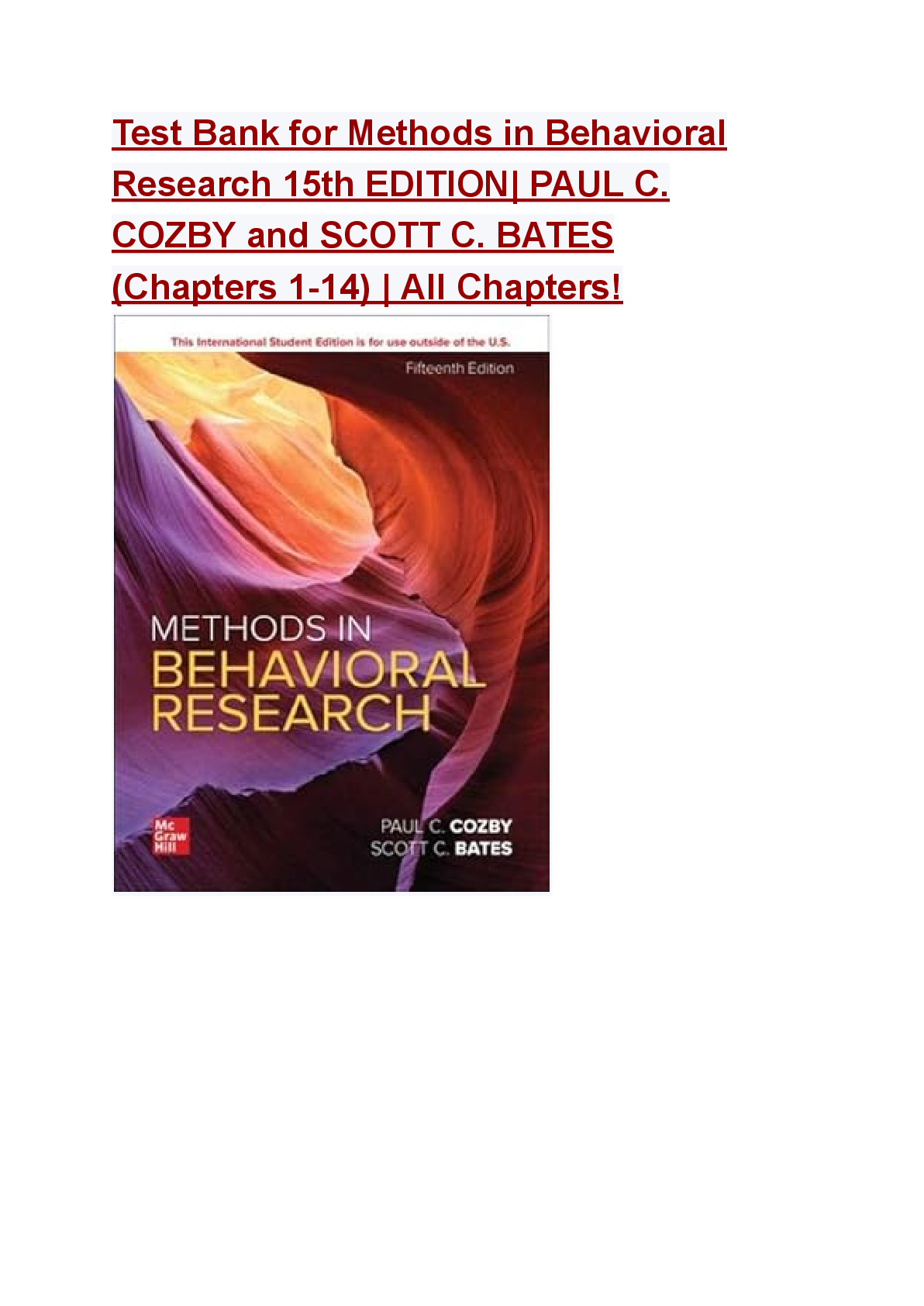 Social and BehavioralTEST BANKS  > Test Bank for Methods in Behavioral Research 15th EDITION| PAUL C. COZBY and SCOTT C. BATES (Chapters 1-14) | All Chapters A+